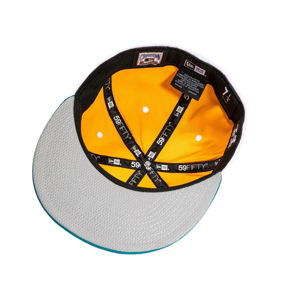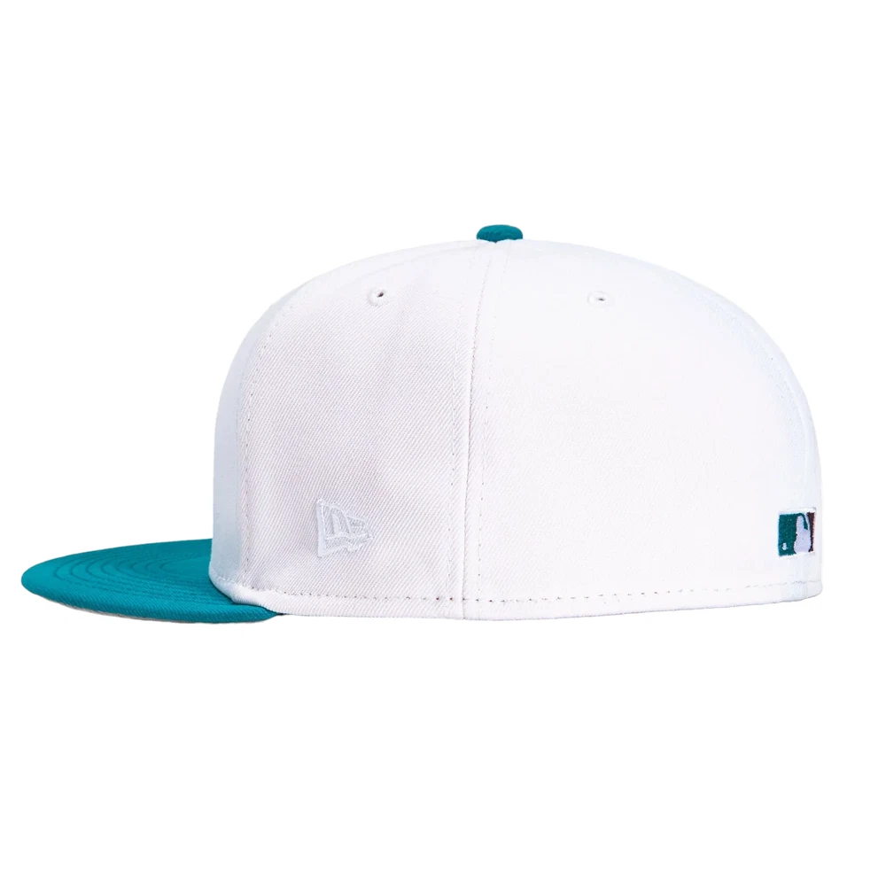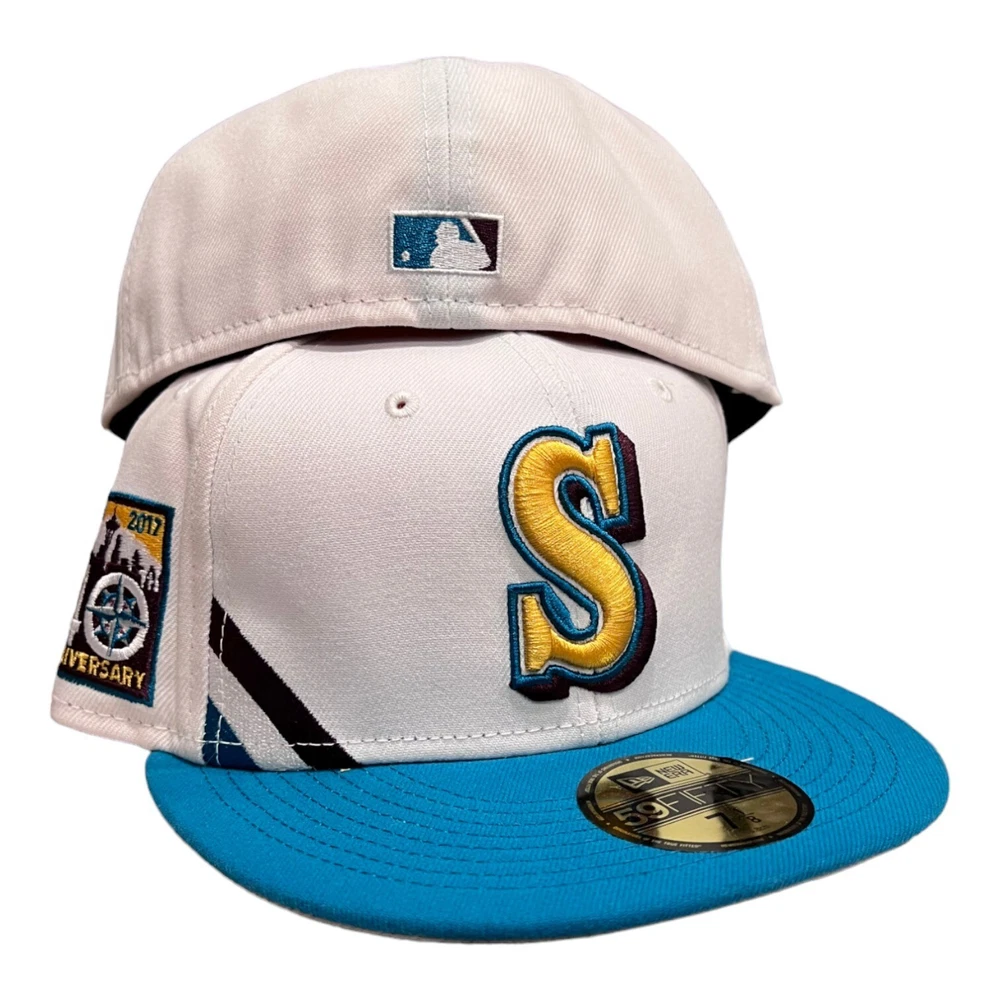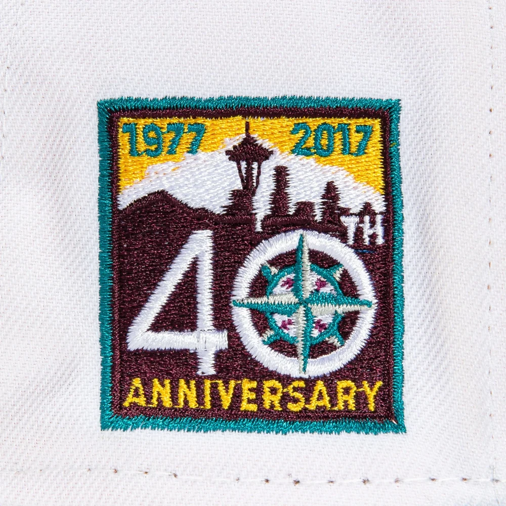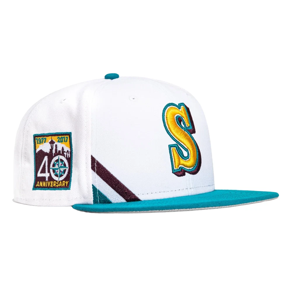 New Era Seattle Mariners 59FIFTY Fitted Hat New With Tags If you have any questions please ask before purchasing. Check Out Thousands Of Other Hats In Our Store Details: Commemorate the 40th Anniversary in this Seattle Mariners 59FIFTY hat. This New Era accessory features an anniversary applique graphic on the side and the Seattle Mariners logo proudly embroidered on the front. The fitted construction ensures a classic feel and look for a quality addition to your collection of gear. All of these pieces were produced in Bangladesh with 100% polyester. All of the White/Teal hats are equipped with white crowns, teal top buttons and upper visors, classic gray Diamond Era under visors, a yellow gold interior liner and a black sweatband with the Hat Club logo affixed. The front logos, side patches and flat-stitched batterman logos are sewn with a combination of yellow gold, white, teal, gray and maroon threading. New Era 59Fifty Fitted Hat White Crown Teal Visor Team Logo Embroidered on Front 40th Anniversary Embroidered on Right Panel Grey Mesh Undervisor Black Mesh Sweatband 100% Polyester Made In Bangladesh