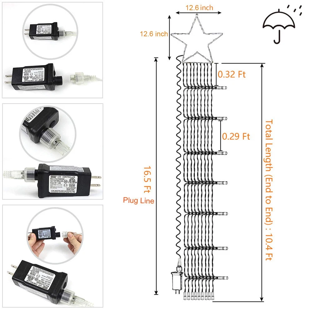 FuNiao Outdoor Christmas Decorations Star String Lights 320 LED Waterfall Christmas Tree Lights Outside Christmas Decorations Lights The christmas tree top star lights work great with trees from around 8 feet to 13 feet tall. You can also hang the star lights under the eaves, gutter or porch, place them on fences and stair posts, illuminate windows, arrange on bedroom shelves or furniture, etc. Light up Your Christmas with this star string lights! Perfect indoor and outdoor decoration for Christmas tree, wedding, New Year, holiday, birthday, party, festival, bedroom, backdrops, porch, patio, house, stage, etc. Specification: - Total number of bulbs: 320 - Total strands of lights: 9 strands - Total number of bulbs on each strand: 32 led - Space between each bulb: 0.29ft - Topper star is lighted with 29 led lights - Size: Pentagram Star in 12.6in, each string light length 10.4ft, plug cable length 16.4ft - Voltage: 29V safe low voltage (Includes UL plug-in transformer) - Power source: Plug-in electric - IP44 Waterproof ★【320 LED Christmas Star Lights】 320 LEDs, 1 top pentagram star with a tail of 9 strand strings of 32 led each, the large star ornaments is 12.6in, each string drops 10.4ft. Plug cable length:16.4ft. Light up your house or yard with the Christmas star string lights! ★【Curtain/Outdoor Waterfall Lights】FUNIAO star string lights work great with trees from around 8 feet to 13 feet tall. You can also hang the treetop star string light to decor your curtain, room, and window. Just hanging the big star about 10 feet up on an exterior curtain/wall/tree, and then drape the 9-star string lights down to the ground. You can also hang them sideways more like a shooting star. Ideal outdoor indoor decorations. ★【8 Lighting Modes & IP44 Waterproof】 The Christmas decorations outdoor star lights have 8 different light patterns: combination, in waves, sequential, slo-glo, chasing/flash, slow fade, twinkle/flash, and steady on. IP44 waterproof waterfall Christmas cone tree light is perfect for indoor and outdoor decorations. ★【Easy & Safety to Use】 Directly plug in and unplug the outside Christmas decorations star lights for power on and off. With a 30V low voltage adapter, this Christmas starlight is safe to touch and will keep at a low-temperature state after lighting up for hours. Safe, power-saving, and eco-friendly. ★【Ideal Gift & Decoration Choice】The Christmas tree star lights can be used as large outdoor tree ornaments, yard Christmas ornaments outdoors, as a Christmas present for your family, loves, friends, colleagues for New Year, birthday, wedding, anniversary, etc. Very beautiful lighted Christmas display for holiday decorations. Enjoy 1 year , any problem, please us.