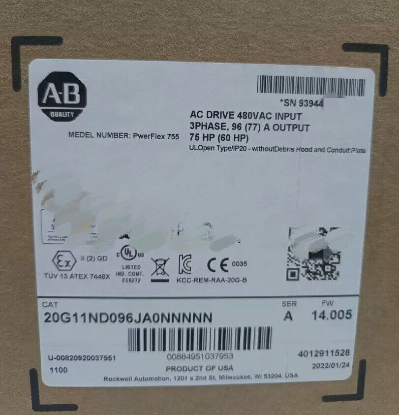 Store Categories Store Categories 755 AC Drive 753 AC Drive Servo Motor( VPL MPL MPM) 70/700/700S AC Drive Smart Motor Controller Other New Factory Sealed Allen-Bradley 20G11ND096JA0NNNNN 755 AC Drive Fast delivery Product Description MPN 20G11ND096JA0NNNNN Brand Allen-Bradley Input Voltage 460 V Model 20G11ND096JA0NNNNN PowerFlex 755 AC Drive, with Embedded Ethernet/IP, Standard Protection, Forced Air, AC Input with DC Terminals, Open Type, 96 Amps, 75HP ND, 60HP HD, 480 VAC, 3 PH, Frame 5, Filtered, CM jumper installed (preferred), DB Transistor, Blank (No HIM) Rated Load 75 HP Number Of Phases 3-Phase More Items About Shipping Return Policy Warranty More Items As an independent distributor of NEW surplus industrial automation items. We buy and sell: Allen Bradley, Siemens, Schneider, Omron, Delta and any other listed manufacturers. All brands, logos, and trademarks identified herein are the property of their respective owners and used solely for identification purposes only. We have developed our own global sourcing relationships with End Users, independent distributors, auction houses, independent contractors and procure our equipment through such sources. All items we sell are 100% NEW. IF you need something that does not list on eBay, Please just leave us a message and we will try to find them by our own global supply chain. About Shipping 1.All USA warehouse parcels will be shipped within 1 work day by USPS Or UPS,Fedex according to your location and parcel weight. 2.IF buyer need them in a hurry, Please choose :UPS 2nd Day Air (USA warehouse ONLY)) and contact to pay the difference. Return Policy 1.If you receive a defective item which you want to return, please contact us when you receive the item. 2.All return items must be returned with its original packaging and accessories. If we confirm the damage happened during the shipment, we will bear the shipping cost for return. 3.We will refund the money to you when we get the return items. Or replace item for you free of charge. Warranty All items we sell are 100% NEW and we provide 1 year warranty after purchase. Copyright © 2023 Dianxiaomi