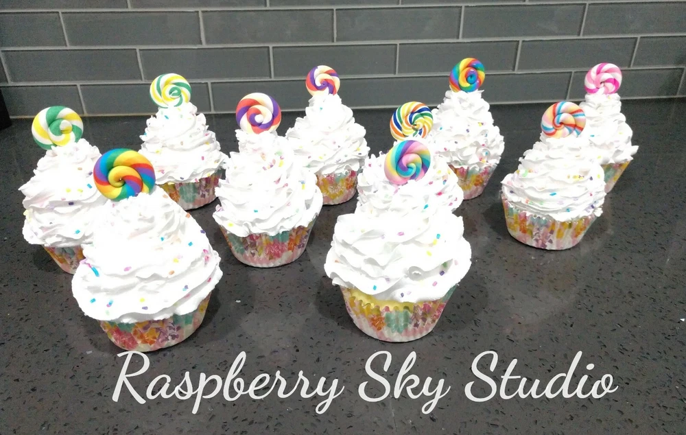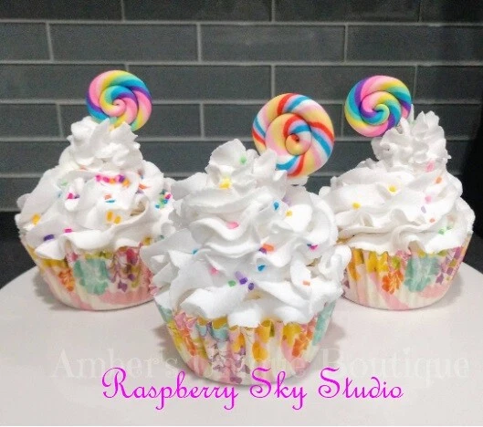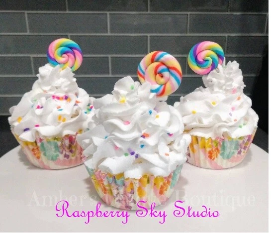 Realistic looking single or set of 3 handmade faux/fake cupcakes with "white icing" ,"rainbow sprinkles, and a "lollipop" on top. **********Please note lollipop color is random - This item is for decorative purposes Only. It is NOT Edible and is NOT meant to be played with. -This item is custom made for each order so it may vary slightly from the photo shown. -Customization is available upon request. Otherwise item will be made as shown in the photo unless otherwise noted. -Please allow 10 days for your item to be shipped as many items are made to order. -Please feel free to contact me with any questions. An original Raspberry Sky Studio Design Get Social with Us!!! Facebook- www.facebook.com/RaspberrySkyStudio Instagram- RaspberrySkyStudio Pinterest- www.pinterest.com/RaspberrySkyStudio Our items come from a clean and smoke free home. Please feel free to ask if you have any questions.