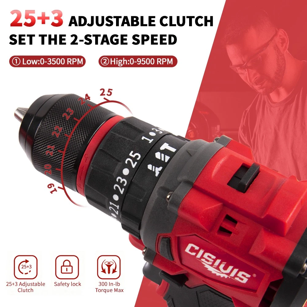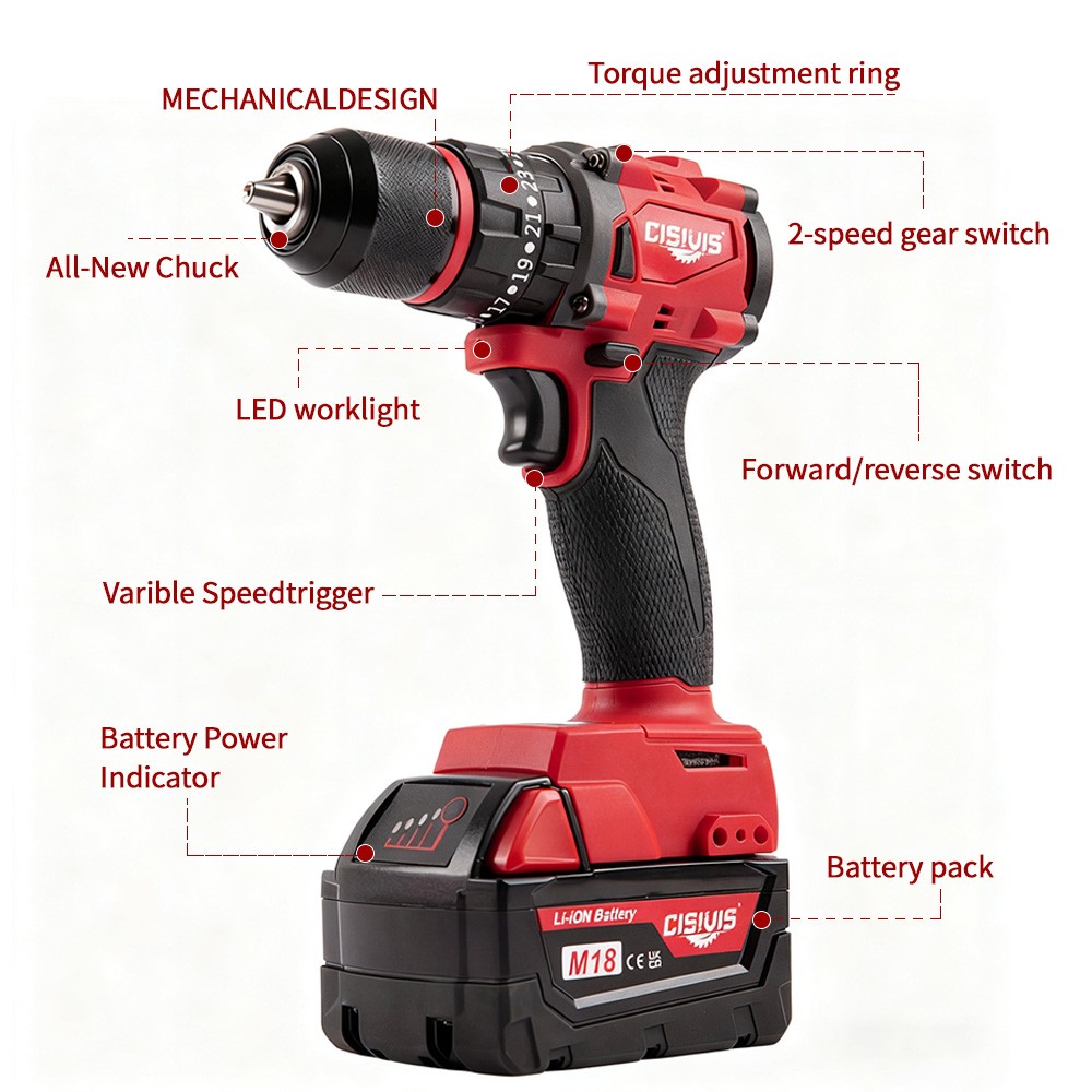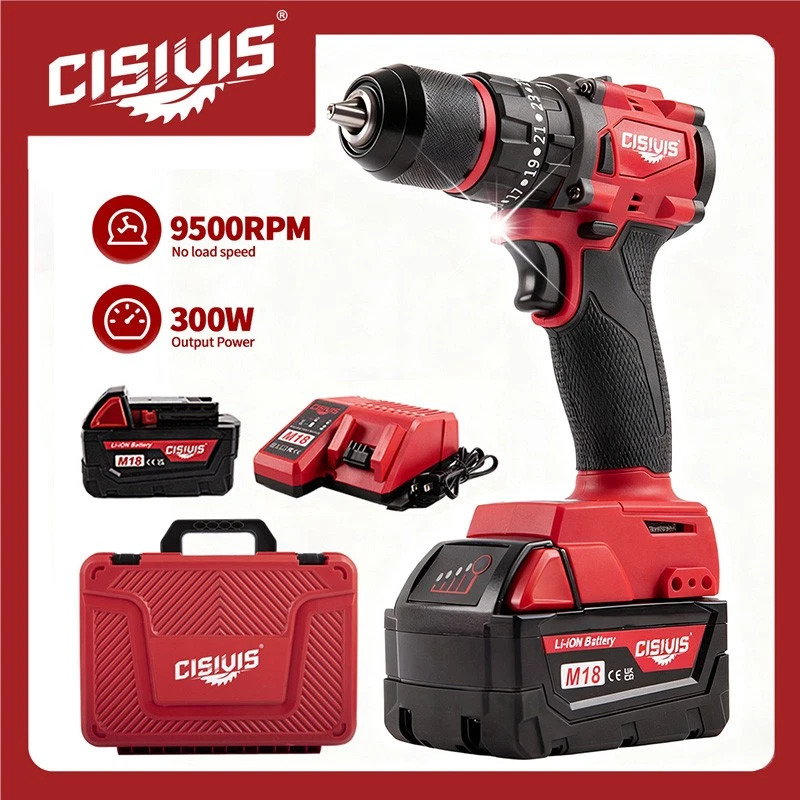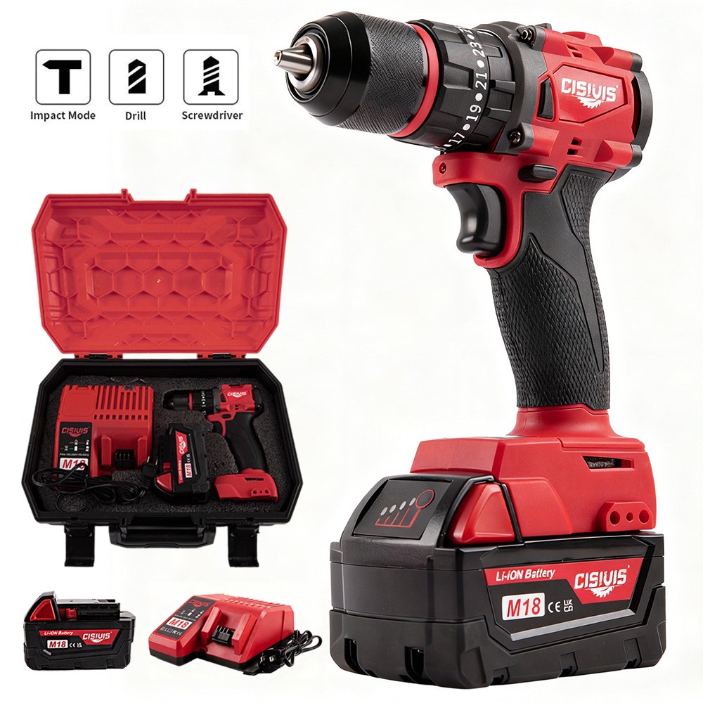Complete Ready-to-Work Kit - Includes Battery & Charger! Get ready to drill and drive right out of the box! The CISIVIS 45N.m Cordless Drill Driver comes as a complete kit with everything you need to start your projects immediately. No need to own existing batteries - this full set delivers professional performance for DIY enthusiasts and professionals alike. Features: COMPLETE READY-TO-USE KIT : Includes M18 battery and fast charger 45N.m MAX TORQUE : Perfect balance of power and control for all tasks 2-SPEED GEARBOX : High speed (0-9500 RPM) for drilling, low (0-3500 RPM) for driving 25+3 PRECISION CLUTCH : Prevents screw stripping and over-driving 13MM ALL-METAL CHUCK : Maximum durability and bit retention BRUSHLESS MOTOR : 50% longer runtime vs brushed motors BUILT-IN WORK LIGHT : LED illuminates dark work spaces ERGONOMIC GRIP : Comfortable handling during extended use What's Included: CISIVIS Drill Driver (Tool Only) M18 Lithium-Ion Battery * 1 Fast Charger * 1 Durable Storage Case * 1 User Manual * 1 Technical Specifications: Maximum Torque: 45N.m No-Load Speed: 0-3500/0-9500 RPM Chuck Size: 13mm Battery: M18 Lithium-Ion (Included) Charger: Fast Charger Perfect For: HOME DIY : Furniture assembly, shelf installation, repairs CONSTRUCTION : Drywall, framing, deck building WOODWORKING : Cabinetry, trim work, hobby projects AUTOMOTIVE : Interior work, repairs, modifications RENOVATION : Remodeling projects of all sizes Why Choose This Complete Kit? READY IMMEDIATELY : No additional purchases needed GREAT VALUE : Save vs buying tool and battery separately PROFESSIONAL POWER : Handles 90% of drilling/driving tasks EASY STORAGE : Durable case keeps everything organized