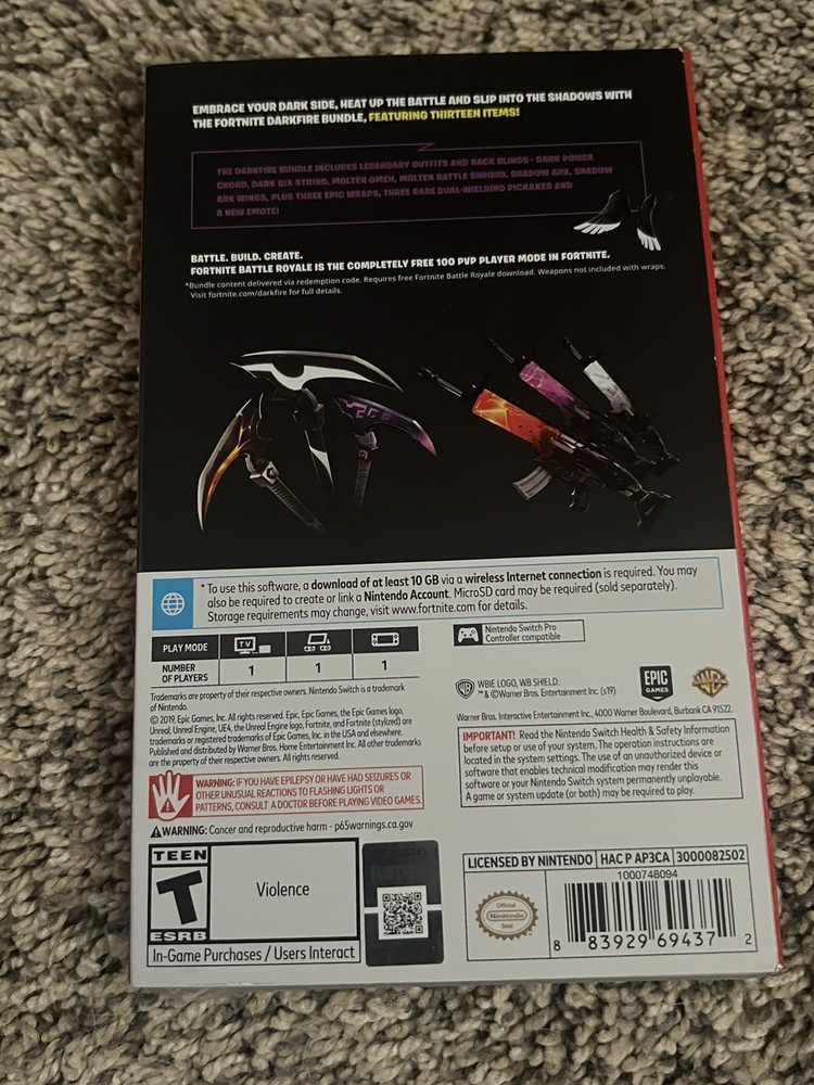 Game Name:Fortnite: Darkfire BundleCountry of Origin:USItem Width:4.10 inMaterials sourced from:USPlatform:Nintendo SwitchRegion Code:Region FreeUPC:0883929694372Item Weight:0.15 lbItem Length:6.64 inCountry/Region of Manufacture:USRelease Year:2019Number of Discs:1gtin13:0883929694372Rating:T-TeenCustom Bundle:NoItem Height:0.50 in