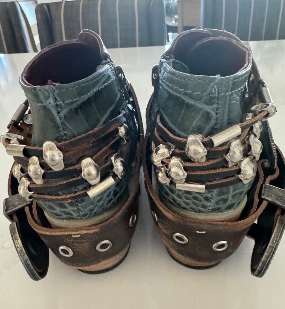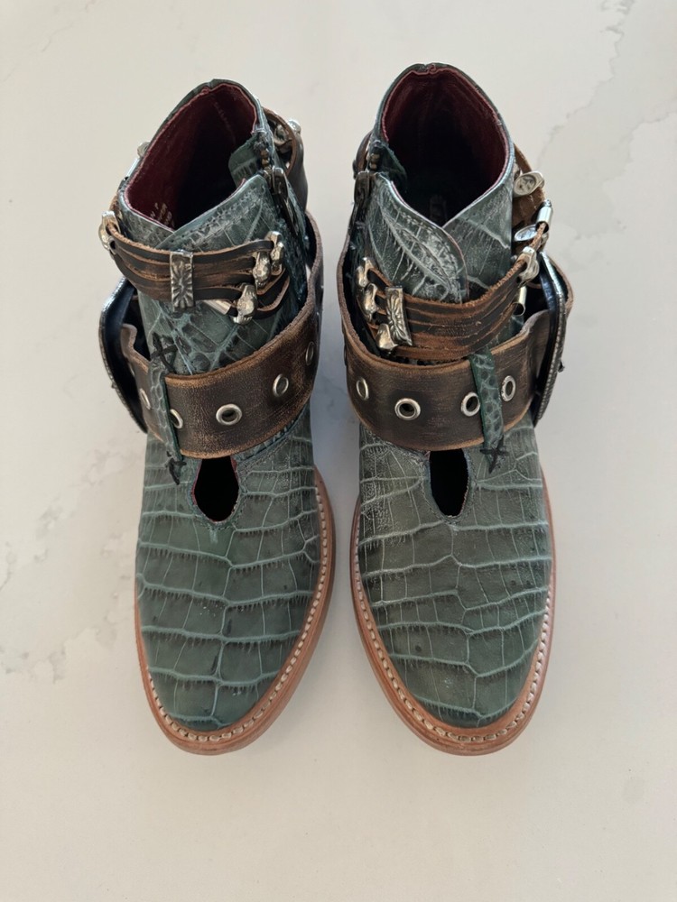 Brand new without box Unleash your wild side with these chic Freebird Saloon Boots, a blend of edgy style and undeniable comfort. Crafted with a vibrant teal leather upper adorned with an eye-catching animal print, these ankle boots are a bold statement piece for any wardrobe. The pointed toe and mid-height block heel offer a sleek silhouette that's perfect for a variety of occasions. Attention to detail is evident in the boots' design, from the smooth leather lining to the secure-zip closure, ensuring a snug and comfortable fit. The durable leather outsole is made to last, making these boots a reliable addition to your shoe collection. Whether you're channeling a Western vibe or just looking for a standout pair of boots, these Freebirds are sure to impress.