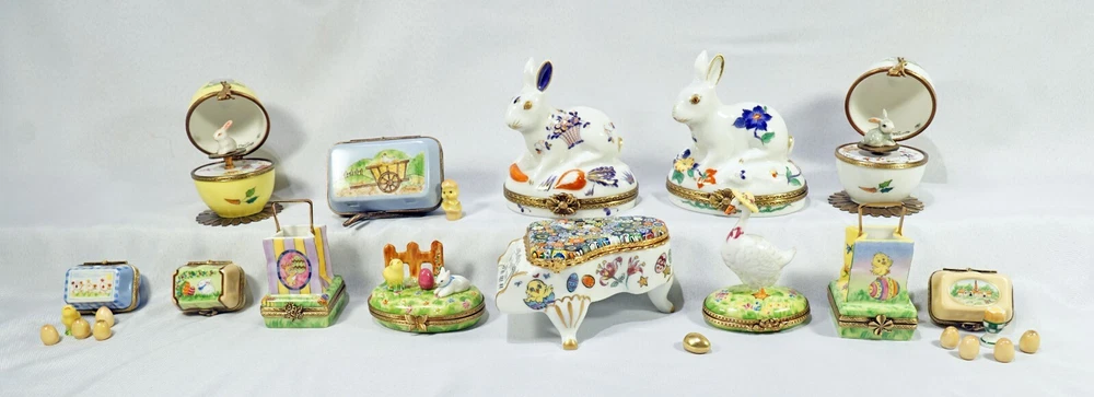 PLEASE ZOOM ON THE SECOND PHOTO TO VIEW SOME LIMOGES BOXES FROM OUR EASTER COLLECTION! NEW !!! AMAZING AND ORIGINAL GIFT !!! HIGH QUALITY!!! YEAR OF DRAGON Authentic French porcelain LIMOGES BOX AMAZING COLORFUL ASIAN Chinoiserie DRAGON - SYMBOL OF GOOD FORTUNE is new and entirely made and decorated in the City of Limoges, France. The dragon is also a symbol of power, strength and good luck. is new and entirely made and decorated in the City of Limoges, France. Measures 3 " L. Hand painting is evidenced on every surface of this amazing Limoges box - beautiful work of art. This wonderful Limoges box is marked LIMOGES FRANCE, Peint Main (Hand painted) and signed by the artist. Comes gift boxed with a Certificate of Authenticity . What a great box to add to your collection! What a wonderful and original gift! PLEASE VIEW OUR OTHER BEAUTIFUL AUTHENTIC FRENCH LIMOGES BOXES IMPORTED FROM LIMOGES FRANCE IN OUR AUCTION AND STORE LISTINGS. WE PROVIDE PROFESSIONAL PACKAGING AND PROMPT SHIPPING OF OUR HIGH QUALITY FRAGILE ITEMS. Shipping is FREE in 48 continental States. Payment is due within 2 days after the end of the auction. Happy bidding! A few words about amazing Authentic French porcelain Limoges boxes... Authentic French porcelain Limoges boxes are highly collectible miniature hinged trinket boxes - gorgeous, detailed, exquisitely hand painted works of art. Kaolin - the "secret ingredient" of fine porcelain was discovered in Limoges, France. Limoges, Meissen and Sevres became the porcelain manufacturers royalty had to own. Limoges porcelain boxes are still handmade and hand painted by artists as they were three hundred years ago. These amazing fine art objects are created in different shapes and colors (beautiful rare music boxes, classical, detailed animals, art, baby, birds, beach, books, casino, dance, fashion, food, games, garden, home furniture, judaica, music, patriotic, perfume, portraits, sea treasures, sports, tea time, travel, fruits, vegetables, etc.) for different occasions (Birthday, Wedding, Christmas, Chanukah, Easter, New Years, Halloween, Independence Day, Thanksgiving, Valentine's Day, Mother's Day, Father's Day, St, Patrick's Day, etc.). Please visit our store I&R GIFTS INTERNATIONAL often where you can purchase unique and amazing gifts for any occasion!