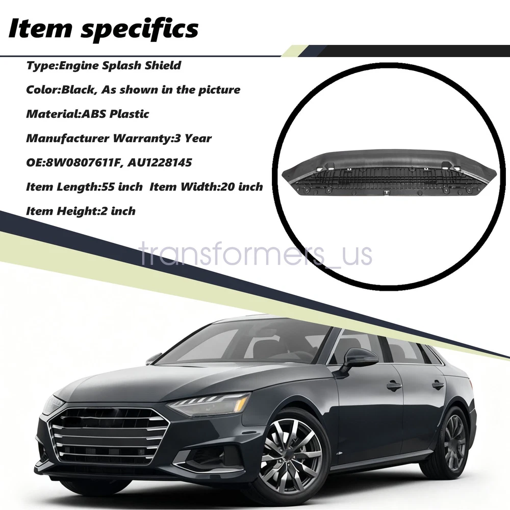 Engine Splash Shields Front 8W0807611F For Audi A4 Quattro S4 2020 2021 New Specification: Condition:Brand New Type:Engine Splash Shield Placement on Vehicle:Front Lower OE:8W0807611F, AU1228145 Interchange Part Number:8W0807611F, AU1228145 Fits: Audi 2020 A4 (submodel: Komfort, Premium, Premium Plus, Prestige) 2020 A4 Quattro Ultra sport 2020-2021 A4 Quattro (submodel: Komfort, Premium, Premium Plus, Prestige, Progressiv, Technik) 2020-2021 S4 (submodel: Premium, Premium Plus, Prestige, Progressiv, Technik) Features: Parts are perfect aftermarket product and designed to factory specifications Easy installation,no modification,direct replacement for old parts Package: 1 x Front Engine Splash Shields (as shown in the picture) Note: Communication is the best way to solve the problem. If you have any problems after purchasing, please contact us in time, before opening return or case. About us: Ready to handle tough environments Factory direct pricing without middleman mark-ups In stock in the USA and Ship From KY or CA Limited Lifetime Guarantee against workmanship and defects (for the original owner) General Policies : Dear customer,if you have any questions,you can contact us,we will provide the best service for you. Shipping policy : The item will be shipped within 24 hours on payment received except the holidays.(except weekends & official holidays). You can log on to eBay to check your logistics tracking number. Please confirm address before purchase, and cannot change address once purchased. If you need to receive the item quickly, please contact us, you can pay the postage to choose other logistics. Payment: Please purchase and pay for the item through the eBay,only accpected the paypal payment. Returns: Please contact us first when return, exchange and refund is required. Any direct return of purchased items will not be processed. Item must be returned in new condition, as received with all accompanied accessories and literature, including the factory carton. Shipping, handling is not refundable unless item is returned because of defect. If the product is defective or damage upon arrival,please contact us immediately,we will provide the solve the problem. Returns accepted within 30 days of delivery date and item must be in original new condition. About us: Our goal is complete customer satisfaction. We will be very honored to provide you with quality service. If there is an issue with shipping or the item you purchased please contact us via ebay message or call us before opening a case or leaving feedback.We will try our best to resolve any kind of issue. Engine Splash Shields Front 8W0807611F For Audi A4 Quattro S4 2020 2021 New Specification: Condition:Brand New Type:Engine Splash Shield Placement on Vehicle:Front Lower OE:8W0807611F, AU1228145 Interchange Part Number:8W0807611F, AU1228145 Fits: Audi 2020 A4 (submodel: Komfort, Premium, Premium Plus, Prestige) 2020 A4 Quattro Ultra sport 2020-2021 A4 Quattro (submodel: Komfort, Premium, Premium Plus, Prestige, Progressiv, Technik) 2020-2021 S4 (submodel: Premium, Premium Plus, Prestige, Progressiv, Technik) Features: Parts are perfect aftermarket product and designed to factory specifications Easy installation,no modification,direct replacement for old parts Package: 1 x Front Engine Splash Shields (as shown in the picture) Note: Communication is the best way to solve the problem. If you have any problems after purchasing, please contact us in time, before opening return or case. About us: Ready to handle tough environments Factory direct pricing without middleman mark-ups In stock in the USA and Ship From KY or CA Limited Lifetime Guarantee against workmanship and defects (for the original owner) General Policies : Dear customer,if you have any questions,you can contact us,we will provide the best service for you. Shipping policy : The item will be shipped within 24 hours on payment received except the holidays.(except weekends & official holidays). You can log on to eBay to check your logistics tracking number. Please confirm address before purchase, and cannot change address once purchased. If you need to receive the item quickly, please contact us, you can pay the postage to choose other logistics. Payment: Please purchase and pay for the item through the eBay,only accpected the paypal payment. Returns: Please contact us first when return, exchange and refund is required. Any direct return of purchased items will not be processed. Item must be returned in new condition, as received with all accompanied accessories and literature, including the factory carton. Shipping, handling is not refundable unless item is returned because of defect. If the product is defective or damage upon arrival,please contact us immediately,we will provide the solve the problem. Returns accepted within 30 days of delivery date and item must be in original new condition. About us: Our goal is complete customer satisfaction. We will be very honored to provide you with quality service. If there is an issue with shipping or the item you purchased please contact us via ebay message or call us before opening a case or leaving feedback.We will try our best to resolve any kind of issue.