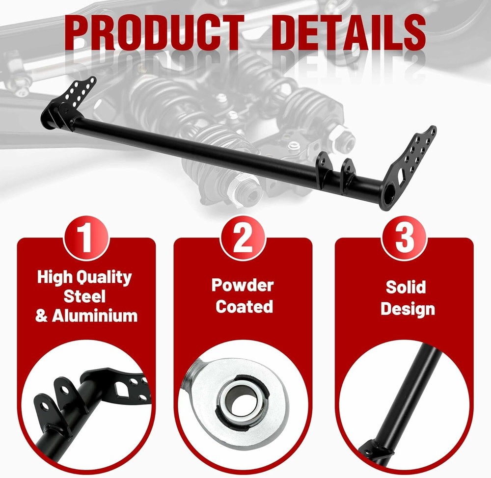 Front Traction Control Tie Bar Kit Fit for Honda Civic 92-95 Acura Integra 94-01 Item Description 【Fitment】: Suspension Traction Control Tie Bar Arm Kit fits for Honda Civic 5th EG, EH, EJ1/2. 1992 1993 1994 1995, for Honda Civic 6th EK3/4/5/9, EJ6/7/8/9, EM1. 1996 1997 1998 1999 2000, for Honda Del Sol. 1993 1994 1995 1996 1997, for Acura Integra DC. 1994 1994 1995 1996 1997 1998 1999 2000 2001. 【High-quality Material】: The Traction Control Tie Bar is made of high quality steel and aluminium structure for high strength and durability. And the suspension lower tie bar adopts a powder coating process to ensure stable performance and long-lasting lifespan. 【Function】: The Traction Bar is designed to increase the rigidity and stability of a vehicle's front suspension. Prevent the spring from tightening when it breaks. It reduces unnecessary movement and can better deal with acceleration, turning and bumps. 【Easy to install】: After installing the drawbar, the front suspension will become harder, thus increasing the traction to the ground, saving time and improving use efficiency. 【Adjustable Angle】: The front traction suspension control lower tie bar brace kit can rotate 360 degrees to maintain a high degree of flexibility in order to better cope with acceleration, rolling and bumps. Installation steps Remove the old crossmember Remove both front tow hooks. Mount the Traction bar without the radius arms. Install radius arms. Bolt the front first where it goes on the bar loosen up the nut on the heims and adjust length until the holes line up to the top of the front lower control arm (be sure to count the threads on the heims to make sure both side is equal length) Tighten up all bolts and make sure to not forget the nut on the heims. Specifications Condition:100% Brand New Warranty: 90 Day Material: T-304 light weight stainless steel Color: Black Fitment Front Traction Suspension Control Lower Tie Bar Kit Comepatible with 1992 1993 1994 1995 Honda Civic 5th EG, EH, EJ1/2. Comepatible with 1996 1997 1998 1999 2000 Honda Civic 6th EK3/4/5/9, EJ6/7/8/9, EM1. Comepatible with 1993 1994 1995 1996 1997 Honda Del Sol. Comepatible with 1994 1994 1995 1996 1997 1998 1999 2000 2001 Acura Integra DC. Please Double-Check that this is compatible with your vehicle. Package Included 1 Pc Cross Bar 2 Pcs Tie Bar 2 Pcs Bracket 1 Pc Accessory Pack As pictures show FAQ: I purchased by mistake, how do I cancel the order? Please contact us ASAP. If the item has not been shipped out we can cancel the order for you. If the item was shipped out you can refuse the package and wait for the item to return to us. I received your item but it does not fit or is defective Please contact us so we can assist you on the matter. Buy with confidence Our quality is based on meeting the requirements of the manufacturer and improvement them in design problems manufacture. NOTE: (1)It would be highly appreciated if you might contact us first once you have any problems concerning the items. And you can expect all the issues would be resolved ASAP! (2)Please let us know before you send us the neutral/negative feedback that wont help to finish the issues. And I will definitely try my best to provide the best solutions which would meet our satisfactory! (3)According to the distance of the receipt address items would be sent from CA or NJ