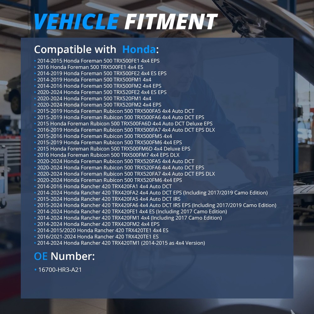 MPN 16700-HR3-A21 16700HR3A21 16700-HR6-B01 15412-HP7-A01 Warranty 1 Year For Honda Models: Rancher 420 4x4 AT TRX420FA1/TRX420FA2/TRX420FA5/TRX420FA6 2014-2024(Exclude 2014 TRX420FA & TRX420FPA Edition) Rancher 420 4X4 ES TRX420FE1 2014-2024 Rancher 420 4X4 TRX420FM1/TRX420FM2 2014-2024 Rancher 420 2x4 ES TRX420TE1 2014-2024 Rancher 420 2x4 TRX420TM1 2014-2024 Foreman 500 4x4 ES TRX500FE1/TRX500FE2 2014-2019 Foreman 500 4x4 TRX500FM 2014-2019(All Edition) Rubicon 500 TRX500FA 2015-2019(All Edition) Rubicon 520 TRX520FA 2020-2024(All Edition) Foreman 520 TRX520FE2 2020-2024 Foreman 520 TRX520FM 2020-2024(All Edition) Order Includes: 1 x Fuel Pump +1 x Oil Filter Width: 162.5 mm | 6.40" Length: 285.75 mm | 11.25" 16700-HR3-A21 Fuel Pump & Oil Filter For Honda Rancher 420 TRX420 4x4 2014-24 MPN 16700-HR3-A21 16700HR3A21 16700-HR6-B01 15412-HP7-A01 Warranty 1 Year For Honda Models: Rancher 420 4x4 AT TRX420FA1/TRX420FA2/TRX420FA5/TRX420FA6 2014-2024(Exclude 2014 TRX420FA & TRX420FPA Edition) Rancher 420 4X4 ES TRX420FE1 2014-2024 Rancher 420 4X4 TRX420FM1/TRX420FM2 2014-2024 Rancher 420 2x4 ES TRX420TE1 2014-2024 Rancher 420 2x4 TRX420TM1 2014-2024 Foreman 500 4x4 ES TRX500FE1/TRX500FE2 2014-2019 Foreman 500 4x4 TRX500FM 2014-2019(All Edition) Rubicon 500 TRX500FA 2015-2019(All Edition) Rubicon 520 TRX520FA 2020-2024(All Edition) Foreman 520 TRX520FE2 2020-2024 Foreman 520 TRX520FM 2020-2024(All Edition) Order Includes: 1 x Fuel Pump +1 x Oil Filter Width: 162.5 mm | 6.40" Length: 285.75 mm | 11.25" Weight:3lbs Payment Delivery details Terms of sales About us Contact us Payment 1.We only accept PayPal. PayPal is the only online payment method we accept. Please make sure you have a valid/confirmed PayPal account prior bidding. 2.All Paypal Payments must be Confirmed. Payment must be made within 48hrs of the auction end time. Non-Paying bidders will be reported. 3.When you get your package,maybe you will pay some charges, it's taxes for local customs,not pay to us, and the fees are depends on the customs, all buyer are same. Delivery details 1.Items will be shipped within 2 business days after payment is received. 2.We ship to your eBay address. Please make sure your eBay address is correct. Buyer takes responsibility if eBay address is wrong. 3.Import duties, taxes and charges are not included in the item price or shipping charges. Please check with your country customs office for these additional charges. 4.We shipping using UPS or USPS from our nearest warehouse to you. Tracking numbers will be emailed upon shipment. Terms of sales 1.Please feel free to email us if you have any question. 2.We appreciate you contact us via eBay message when you are not satisfied rather than open case or leave negative feedback directly. We'll try our best to solve the issue. 3.Refund will be issued once we receive your returned items. Buyer is responsible for all return shipping charges. 4.Please contact us for return process before you return the item. 5.All items for exchange or refund must be returned in "as new" condition. About us We are the responsible seller ,always provide high-quality products and best service .If you have any questions, please contact us, and will try our best to help you. Please contact us by eBay Message, and we will reply you within 24 hours. Thank you very much! Contact us We are the professional auto parts manufacturer , and provide line lock, AN hose end fittings , fuel line , fuel filter , fuel regulator , exhaust cutout , exhaust tips , exhaust muffler and so on .The quality of the product to be secured. If you have any questions or any needs , please contact us , and will try our best to help you.