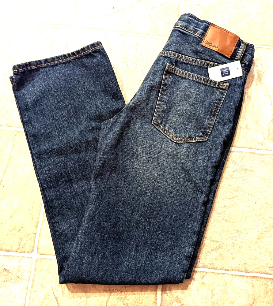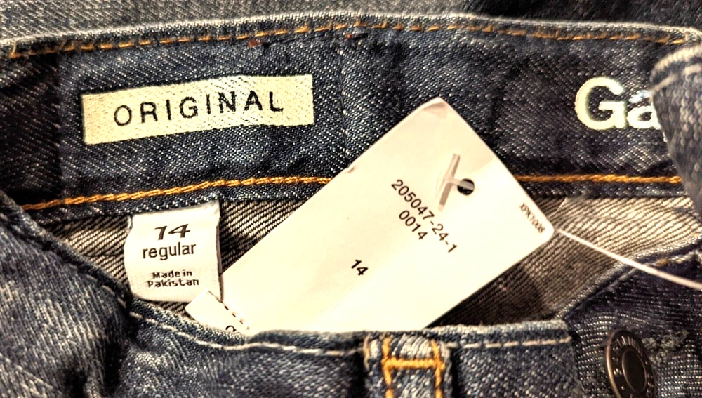 size 14 regular, zipper fly, no stretchy, pockets, adjustable waist Length down the side of leg: 37" Width around bottom of leg: 14" Rise: 9"