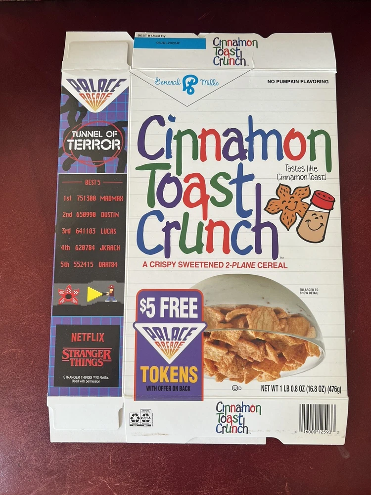 This limited edition General Mills Netflix Shop Stranger Things Cereal Box Set features three different cereal boxes (flat packed), each with a unique design inspired by the popular series. The set includes Lucky Charms, Cinnamon Toast Crunch, and Cheerios, all with colorful and eye-catching packaging that will make them a great addition to any collection. Each box has a limited edition run of 1500, making them a rare find for any fan of the show or cereal collector. The boxes are in great condition but have previously been opened. There is some glue markings at the bottom of the Cinnamon Toast Crunch box that is noticeable but if you put it back into box form it wouldn’t be seen. The cereal inside was just normal cheerios, lucky charms and Cinnamon Toast Crunch. They were not special pieces of any kinds. The boxes ship flat packed. They can be molded back into their original box form or framed to show them flat. You decide. They were created in 2021 as an original piece of merchandise for the Stranger Things series. Whether you're a fan of the show or just love collecting unique cereal boxes, this set is a must-have.