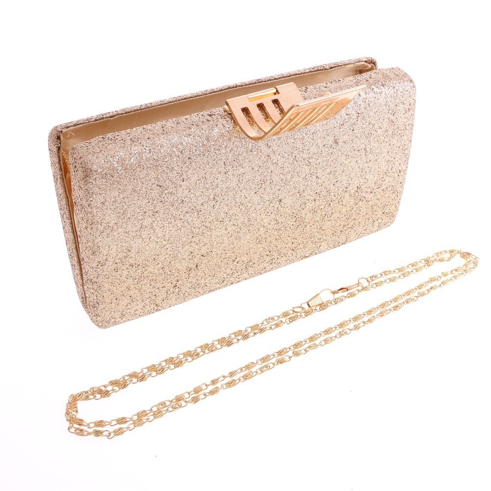 New Gold Metal Glitter Fabric Clutch Evening Bag / Long Chain Strap / Approx Size: 8.5"L x 4.5"H x 1.5"W / Color: Gold ** color of the picture may vary due to lighting ** Condition: Brand New SKU: WYQ141-GLD Color: Gold Design: All orders will ship from USA via UPS or USPS. We expect all local orders will receive the items within 7 business days or less depend the location. Worry free international shipment delay or custom duty fee.