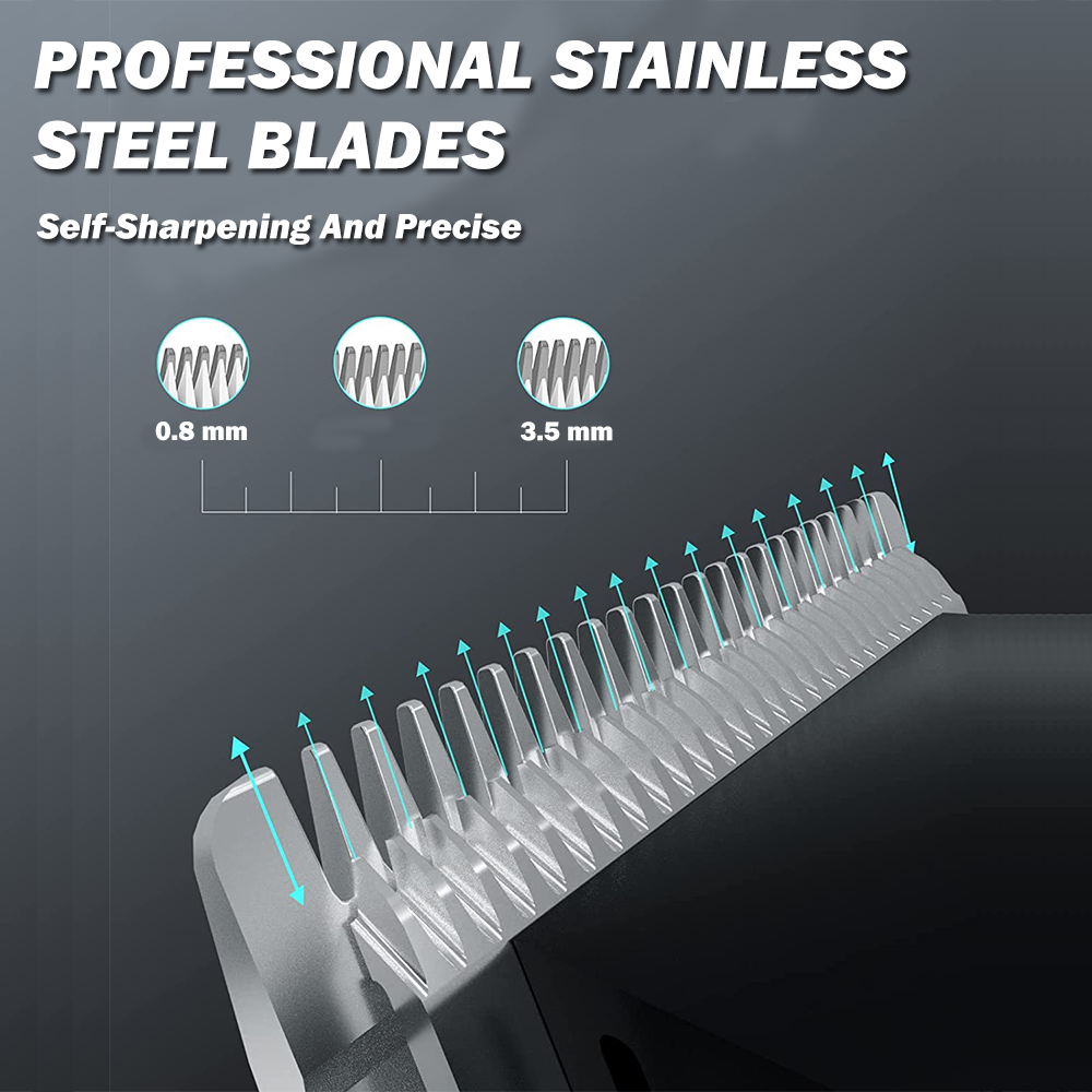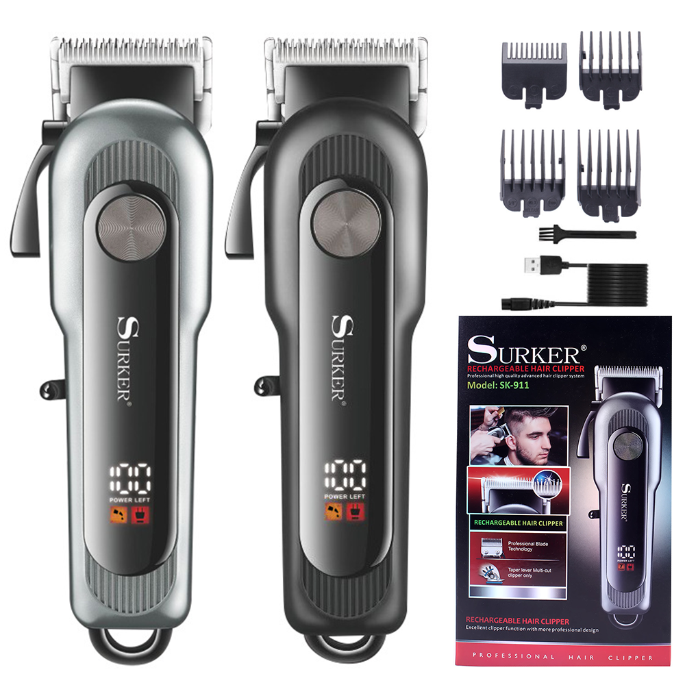 Product details: 1 Using high quality steel, sharp and durable. 2: limit comb * 4 (3/6/9/12mm) 3: The R-type blade safely, cuts hair easily and does not hurt the skin. 4: waterproof design, easy to clean. 5: Large capacity lithium battery can work up to 240 minutes. Product parameters : Brand: Surker Product Name:SK-911 Body weight: 252g Color box size: 23.5*6.5*14cm Machine size: 19*5/7.4*1.9 Inch Color: Black / Grey Voltage: 110-240V 50/60HZ Power 5W, Use Time: Charge 3 hours , Use 150 mins Include: host*1 USB cable*1 limit comb*4, cleaning brush*1