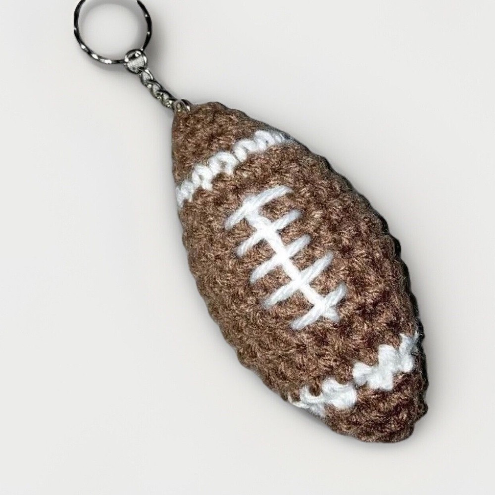 This is a new handmade amigurumi football crochet keychain made of acrylic in multicolor. It is a cute and unique accessory that can be used as a bag or purse charm. The keychain is themed around sports and would make a great gift for a friend, daughter, son, or anyone who enjoys sports. The item is made in the United States and features crocheted accents.