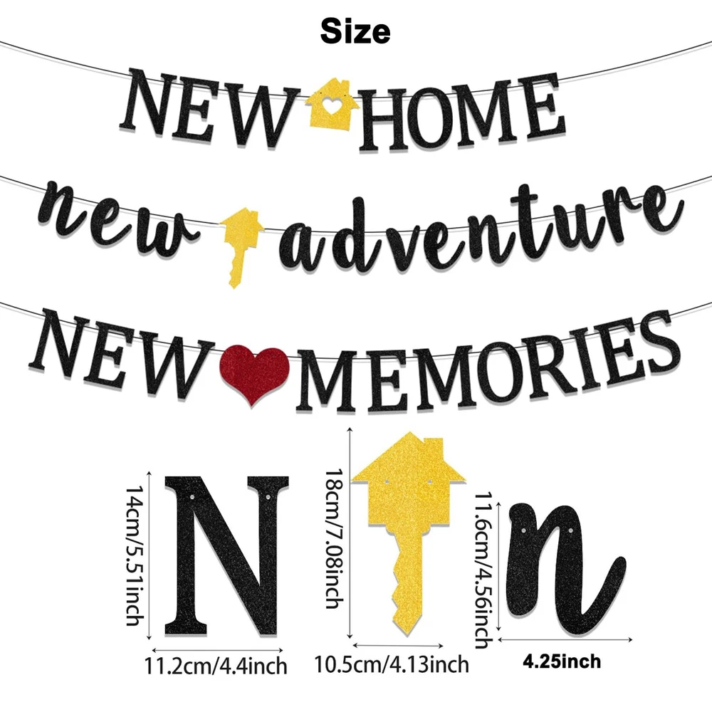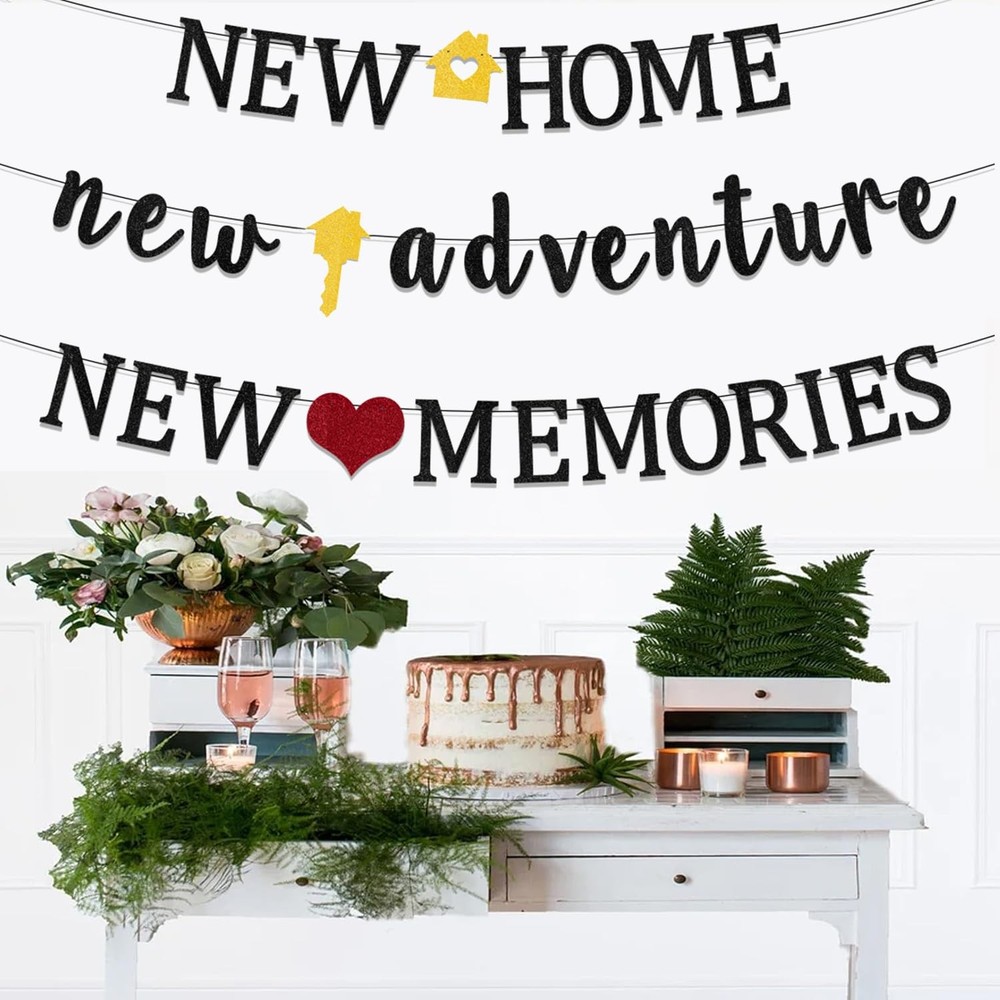 New Home New Adventure New Memories Banner for House Warming Party Decorations Features: PREMIUM PARTY BANNER: Pre-strung black glitter text on durable material makes setup quick and hassle-free for your celebration PERFECT SIZE: Banner measures approximately 6 feet in length, making it an eye-catching centerpiece for any party space HUMOROUS DESIGN: Features the funny phrase "New Home New Adventure New Memories Banner " in sparkly gold letters for a memorable milestone celebration VERSATILE DISPLAY: Includes hanging strings on both ends for easy mounting on walls, between posts, or across doorways COMPLETE DECORATION: Ready to use right out of the package - no assembly required, perfect for indoor or outdoor birthday celebrations SHIPPING We are always working hard to ensure your package arrives as soon as possible. Please understand that some factors like weather, high postal traffic, and the performance of shipping companies are outside of our control. We offer free shipping to the lower 48 states and ship within 3 business days of payment, usually sooner. We do not accept P.O. Boxes. Please provide a physical address.