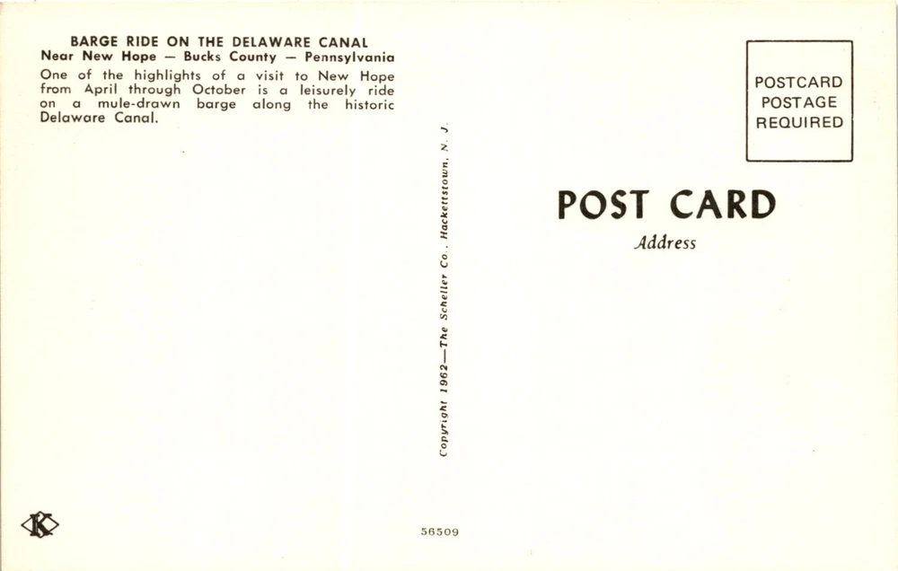 MAKE AN OFFER. THE MORE YOU BUY THE BETTER DEAL I WILL ACCEPT The postcard advertises a barge ride on the Delaware Canal near New Hope in Bucks County, Pennsylvania. This leisurely ride on a mule-drawn barge is a highlight of visiting New Hope from April through October. The Delaware Canal is a historic waterway that stretches 60 miles from Easton to Bristol, running parallel to the Delaware River.
