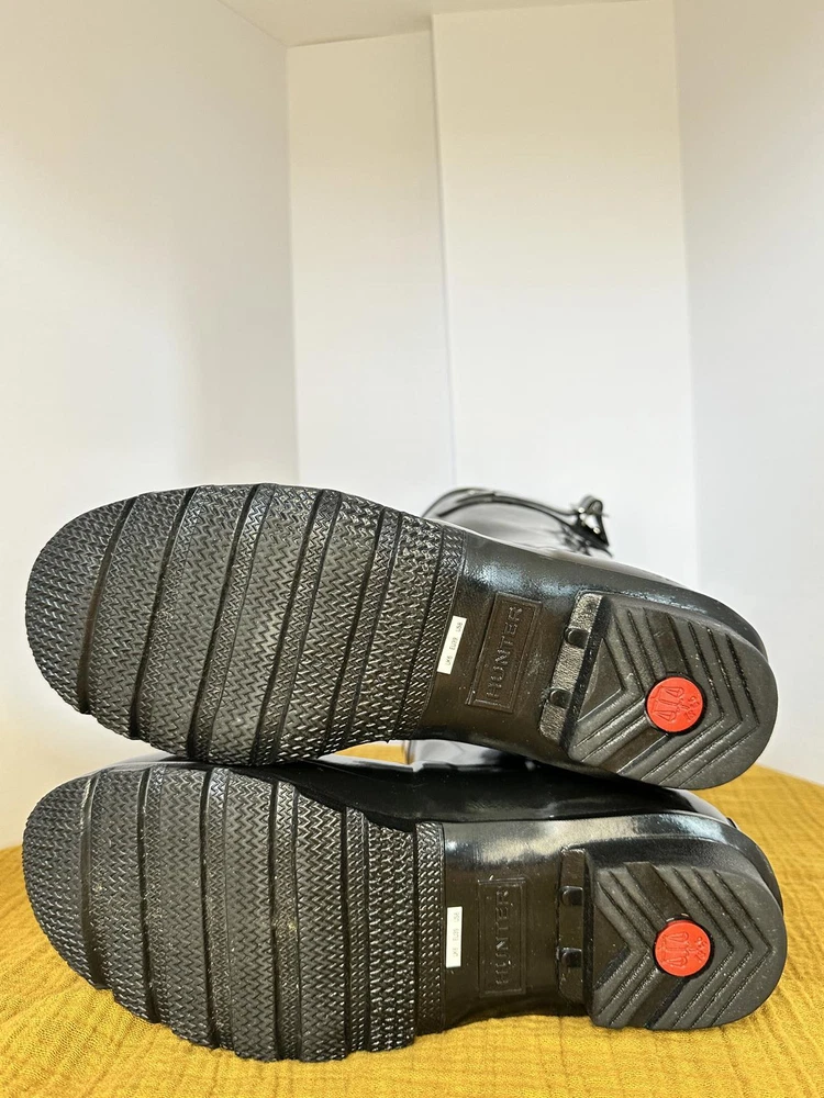 Get ready to tackle the rain in style with these Hunter Original Black Rain Boots in Original Gloss! The Women's Original Short Rain Boot is a shorter version of the iconic Hunter Original Tall Boot and perfect for wet-weather conditions. Formed of natural rubber, each boot is handcrafted and assembled over three days and then vulcanised for superior protection before having the high gloss finish applied. The Hunter Original tread pattern and comfortable 100% recycled polyester lining completes the design on this 100% waterproof boot. - Classic black color for versatile styling - Adjustable strap for a customizable fit - Durable construction for longevity - Textured sole for enhanced traction on slippery surfaces