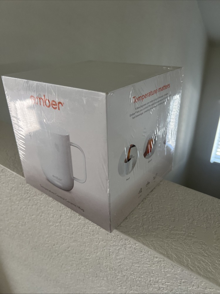 Mug is in the box with plastic, Bluetooth connectable through the Ember app.