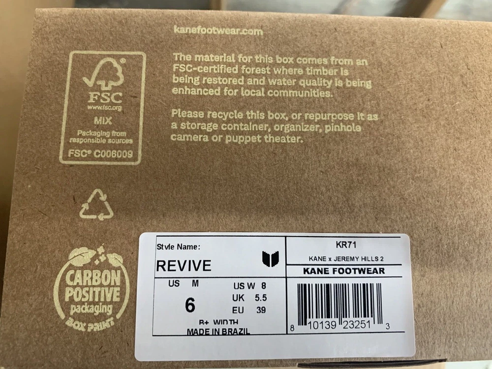 Brand new with box Men's size 6, Women's size 8 All sales are final, no returns Fast shipping! KANE Revive shoes are made of bio-based closed-cell RestoreFoam™. The shoes don’t absorb moisture, so they’re just as functional in water as they are on land, and they’re quick-drying. The KANE Revive shoes can easily be wiped or washed off with soap and water. Please avoid exposure to extreme heat or sun for this can cause the shoes to shrink or warp. Dishwashers, washing machines, or hot cars can also cause the shoes to shrink or warp. The KANE Revive sizing follows the standard sizing for a running shoe. Therefore, the size guide should be utilized according to your typical running shoe size. IN BETWEEN SIZES? We recommend sizing down (ex. if you typically wear size 10.5 - select size 10). For a wider foot, go one half size up (ex. if you typically wear size 10.5 - select size 11).