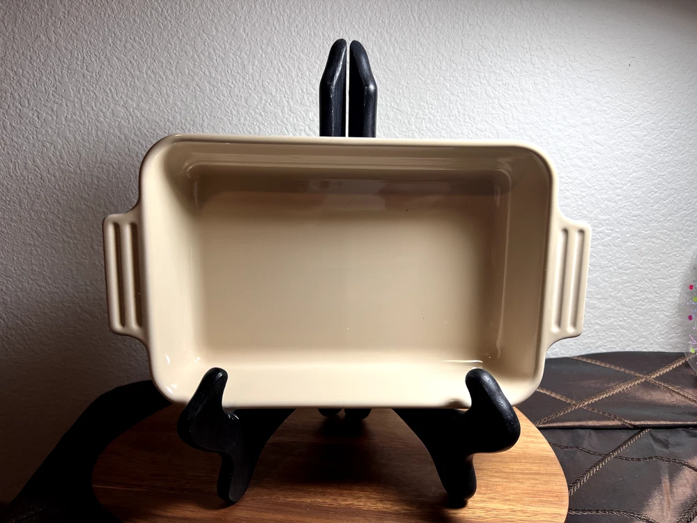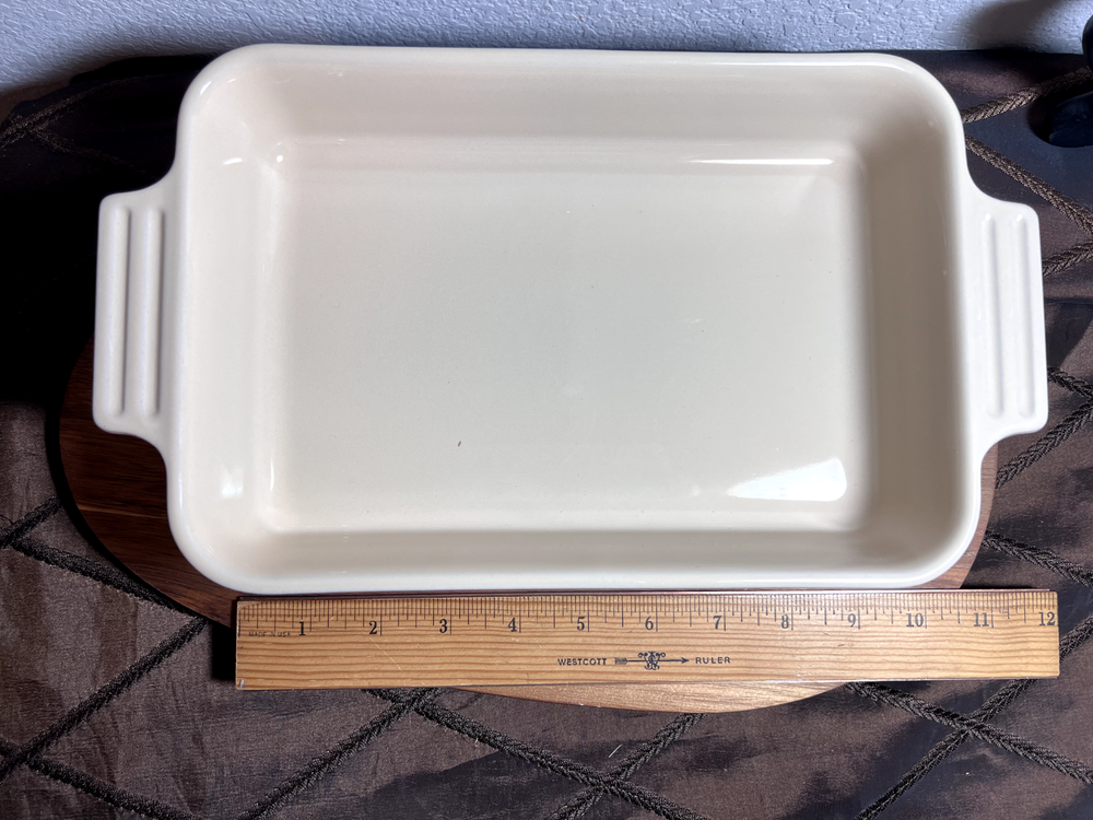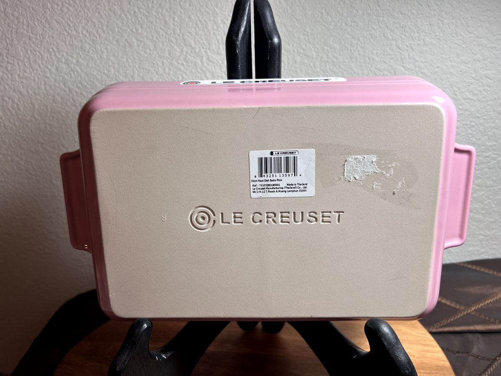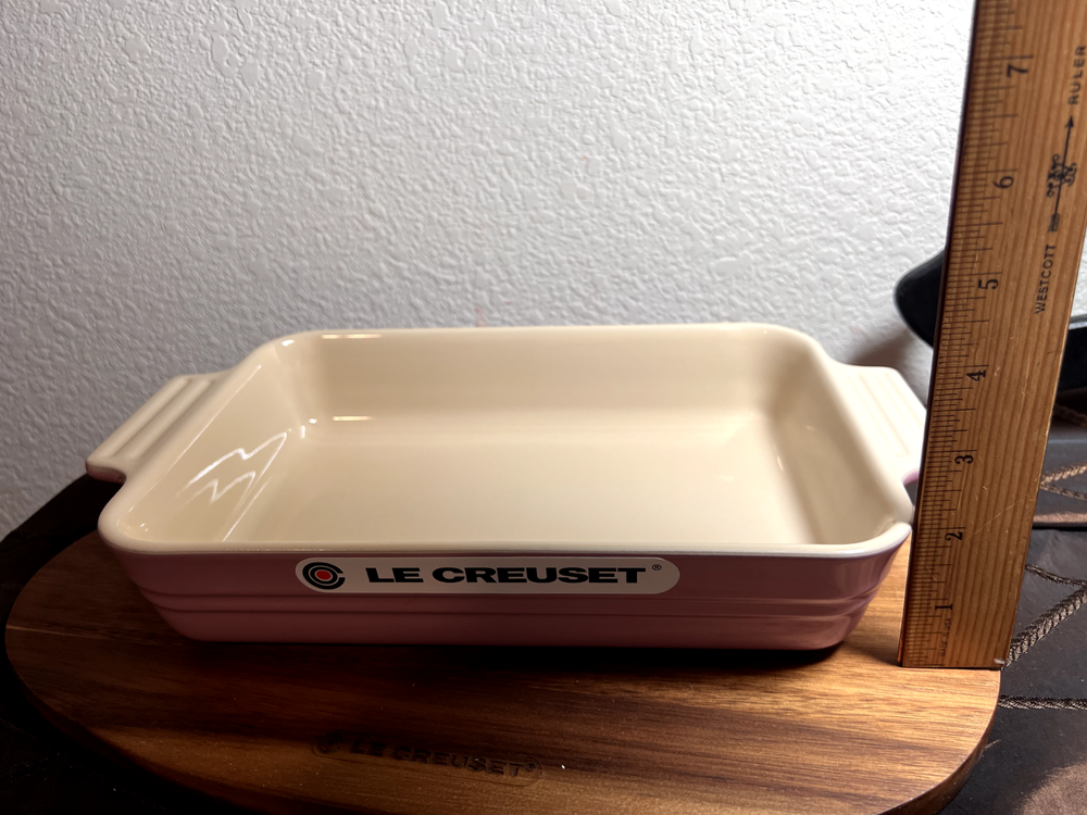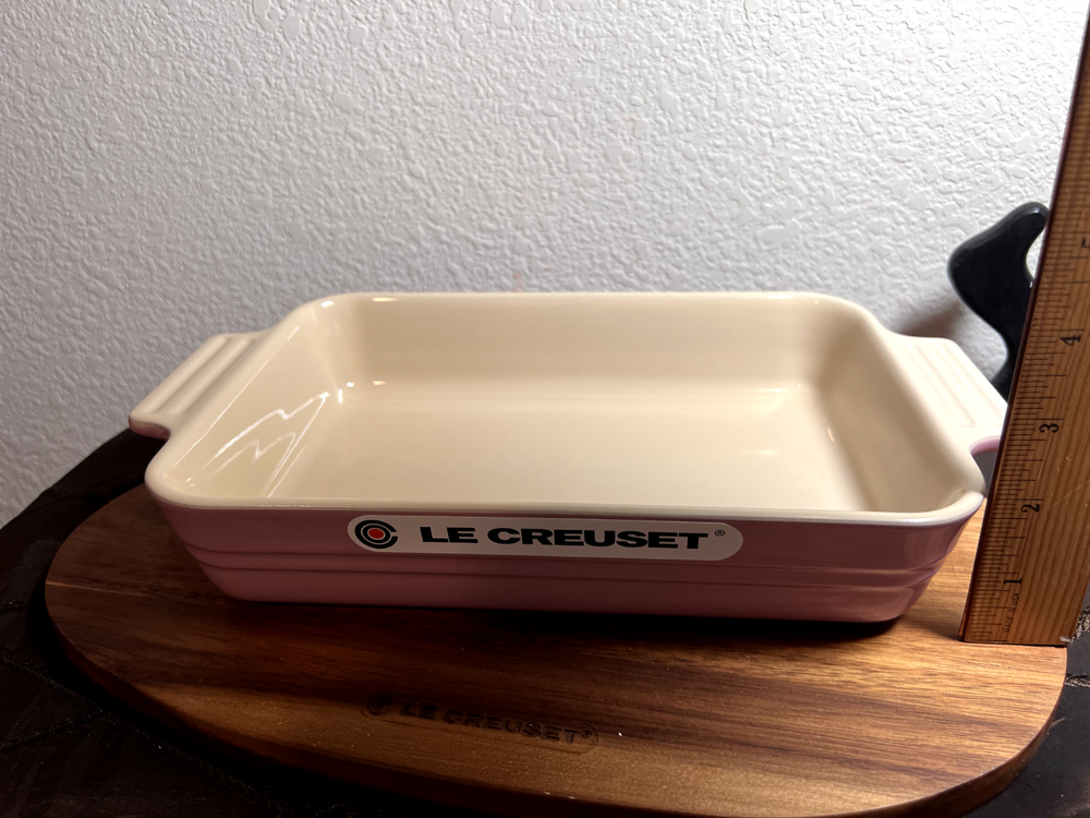 NEW Le Creuset Stoneware Rectangular Casserole Baking Dish This is brand new and 100% authentic!! 1.5QT - 10 in - 25cm Color: Satin Pink COMES FROM A PET FREE AND SMOKE FREE ENVIRONMENT. item will be shipped with USPS or Fedex depending on location.