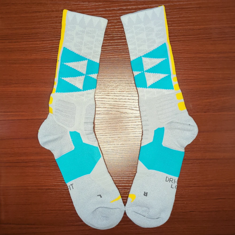 LeBron Nike Hyper Elite Socks Gray/Blue/Yellow Size Large Brand new without tags 100% Authentic Fast Shipping: Ships in 1-2 business days from Illinois Many colors available, check out my page to see them all Message me with any questions The Nike Elite Basketball Crew Socks feature Dri-Fit fabric that keeps your feet cool and comfortable. It’s made for durability and offers a supportive and snug fit. The Nike Elite Basketball Crew Sock is a must own for any basketball player. Perfect for basketball, volleyball, and other sports Pair different colorways with your Kobe's, Lebron's, KD's and more. Performance basketball crew socks deliver superior fit and comfort. Strategically placed cushioning absorbs impact Dri-Fit technology helps keep feet feeling dry and comfortable. Left/right anatomical design for targeted comfort. Ventilation zones promote breath-ability to keep you cool 63% polyester, 18% nylon, 16% cotton, 3% spandex Size Guide Small: Youth 4-6 Medium: Men's 6-8 Large: Men's 8-12 Extra Large: Men's 12-15