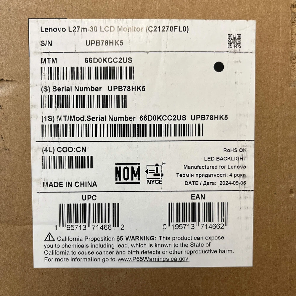 New Lenovo 27" C21270FLO TFT LCD Flat 75Hz Flat Panel Monitor New Lenovo 27" C21270FLO TFT LCD Flat 75Hz Flat Panel Monitor Items included in this sale: New Lenovo 27" C21270FLO TFT LCD Flat 75Hz Flat Panel Monitor DisplayPort Cable Original Box *All originally boxed contents are included. Specifications: Collection Monitor Brand Lenovo Screen Size 27" MPN C21270FLO Condition New Display Type TFT LCD Resolution 1920 x 1080 Refresh Rate 75Hz Panel Type Flat Type Flat Panel Monitor Response Time 4ms Manufacture Year 2021 Manufacture Warranty Yes 12/2025 UPC 195713714662 Serial# UPB78HKC, UPB78HK5 Connections Display Port (1.4) HDMI At the time of this posting we have 2 available. This listing is for one of them. You will receive one in similar condition to the one in the photos with one of the serial numbers listed above. Cosmetic condition: This device is brand new and sealed in the manufacturer's original packaging. Functionality condition: This device is brand new and sealed in its manufacturer's original packaging. It should work according to the manufacturer's specifications. New Lenovo 27" C21270FLO TFT LCD Flat 75Hz Flat Panel Monitor New Lenovo 27" C21270FLO TFT LCD Flat 75Hz Flat Panel Monitor Items included in this sale: New Lenovo 27" C21270FLO TFT LCD Flat 75Hz Flat Panel Monitor DisplayPort Cable Original Box *All originally boxed contents are included. Specifications: Collection Monitor Brand Lenovo Screen Size 27" MPN C21270FLO Condition New Display Type TFT LCD Resolution 1920 x 1080 Refresh Rate 75Hz Panel Type Flat Type Flat Panel Monitor Response Time 4ms Manufacture Year 2021 Manufacture Warranty Yes 12/2025 UPC 195713714662 Serial# UPB78HKC, UPB78HK5 Connections Display Port (1.4) HDMI At the time of this posting we have 2 available. This listing is for one of them. You will receive one in similar condition to the one in the photos with one of the serial numbers listed above. Cosmetic condition: This device is brand new and sealed in the manufacturer's original packaging. Functionality condition: This device is brand new and sealed in its manufacturer's original packaging. It should work according to the manufacturer's specifications. × × × × × × × × × Buy now and save! Shipping info Click the Shipping & Payments tab above the listing description for more info FREE Shipping Click the Shipping & Payments tab above the listing description for more info! Additional delivery notes PICK UP OPTION Sorry, our items are NOT available for pick-up. PAYMENT Immediate payment is required upon selecting "Buy It Now" or upon checking out through the cart. We accept payment via U.S. PayPal accounts and all Major Credit Cards, Debit Cards & Google Pay. We are legally required to collect sales tax in those states and localities where we maintain a physical presence (nexus). The applicable amount of sales tax charged to an order will be calculated based on the shipment destination's state and local sales tax laws. Thank you for shopping with us on eBay! Additional Information No additional information at this time Ask seller a question You might also like New Parker Compax3S Intelligent Servo Drive S025V2F12I20T11M00 New Debra professional wireless Microphone AU400 New Brother INKvestment Tank C30333PKS Yellow, Cyan and Magenta Ink Cartridge EX Broken Vivitar VES529 16.0MP Digital Camera Contact To contact our Customer Service Team, simply click the button here and our Customer Service team will be happy to assist. Ask seller a question © PayMore Shopton Shipping & Payments Shipping is FREE for this item Payment Accepted Payment Methods Immediate payment is required upon selecting "Buy It Now" or upon checking out through the cart. We accept payment via U.S. PayPal accounts and all Major Credit Cards, Debit Cards & Google Pay. We are legally required to collect sales tax in those states and localities where we maintain a physical presence (nexus). The applicable amount of sales tax charged to an order will be calculated based on the shipment destination's state and local sales tax laws. Thank you for shopping with us on eBay! Returns Returns are accepted Items must be returned within 30 days of the auction ending Seller will pay for return shipping. eBay integration by