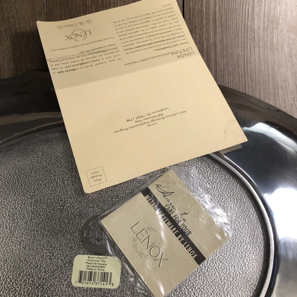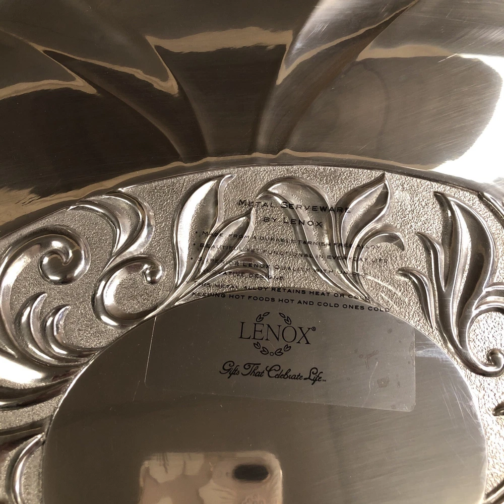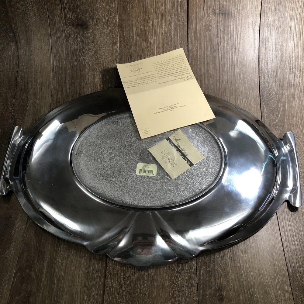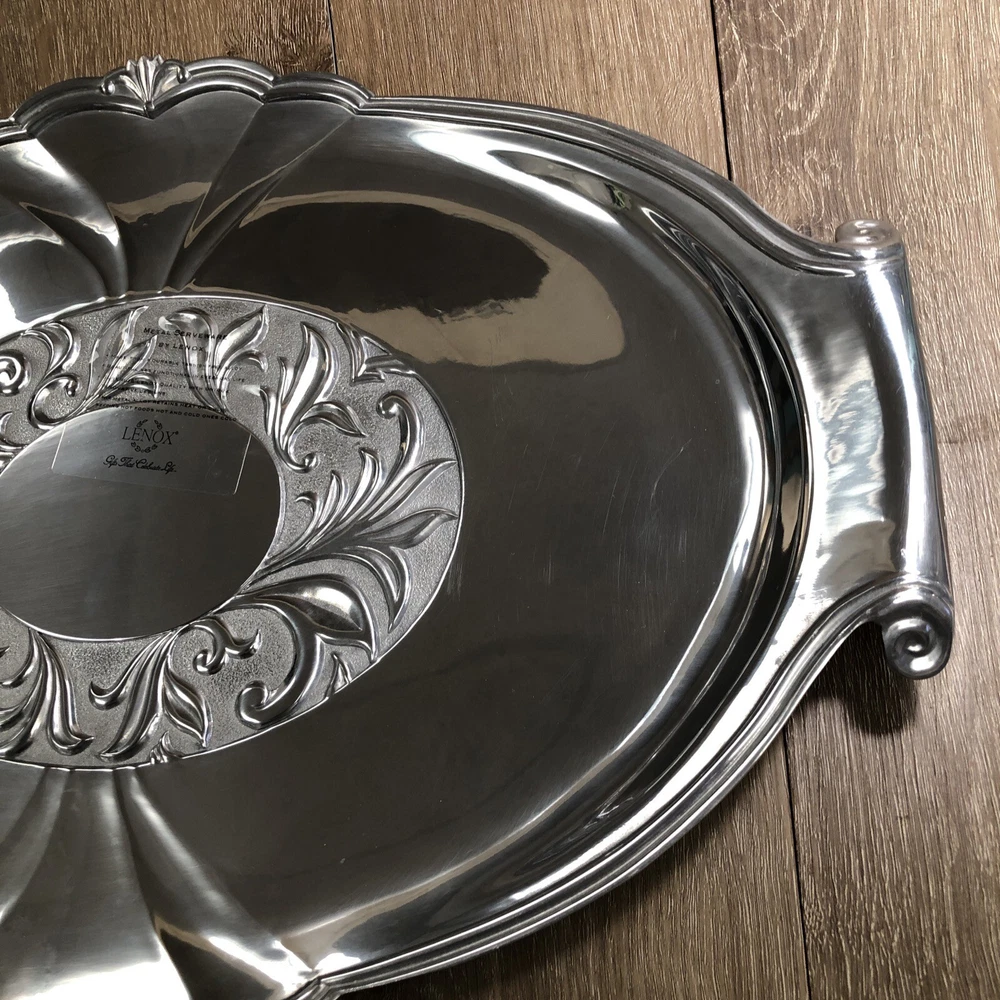 New Lenox Large Metal Serveware Butler's Pantry Oversized Tray By our observations this tray is in new condition. It does have some areas of scratches from being stored. It measures approx 22 1/2 inches in length and 15 1/2 inches in width. Please see pictures for information. We are a thrift shop located in Peachtree City, Georgia and all of our profits are returned to our community. We make every effort to test all electronic equipment that we receive and closely examine everything else which we will describe in detail if needed. If you have any questions, please message us directly and we would be more than happy to answer any of them.