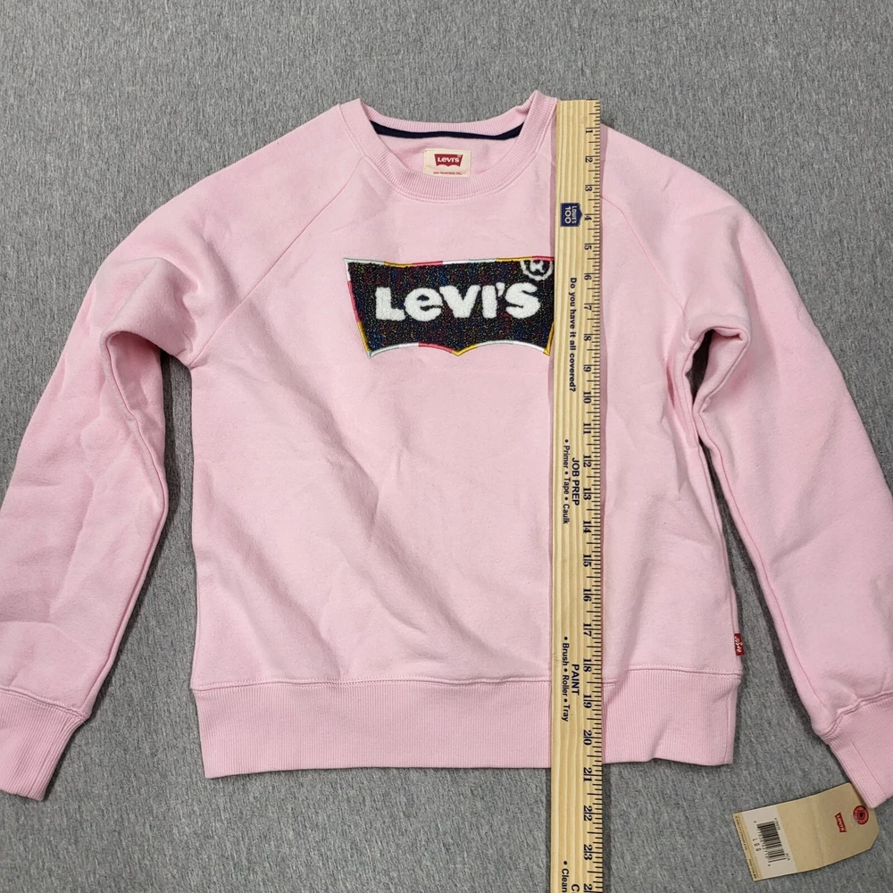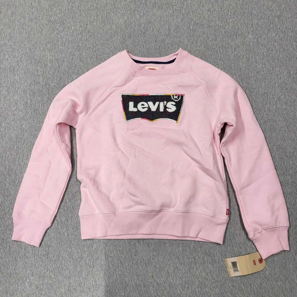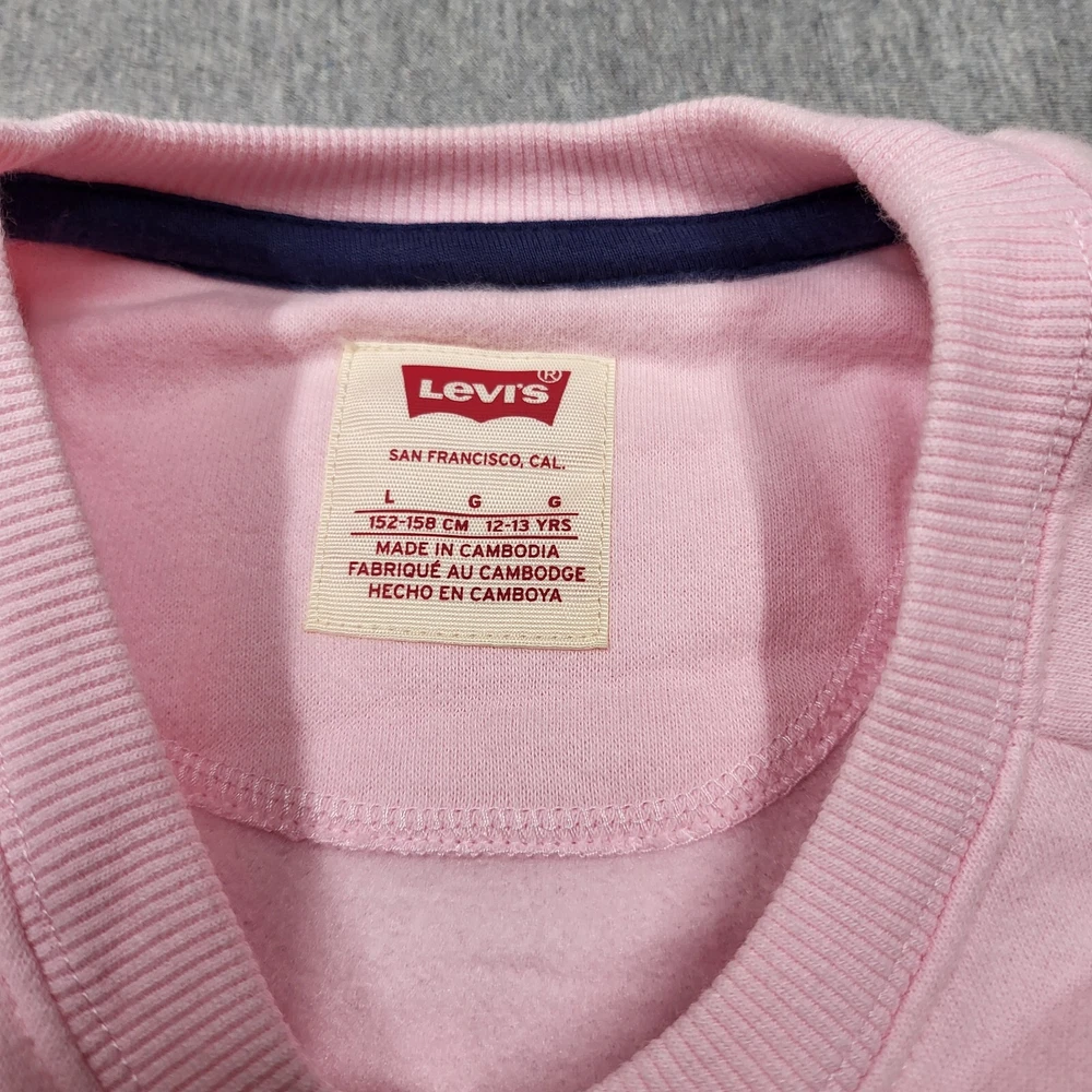 This is a brand new Levis kids' pullover sweater in pink with a big puff logo. This sweater is made of a comfortable and durable cotton blend material, perfect for any occasion. The long sleeve sweater has a crew neckline and is a size large, fitting 12-13 year olds. The sweater has a stylish and trendy Levi's theme, making it a great addition to any girl's wardrobe. It is perfect for casual outings or can be dressed up for more formal occasions. This sweater is a must-have for any fashion-savvy young girl. Get your hands on this new Levis kids' pullover sweater now!