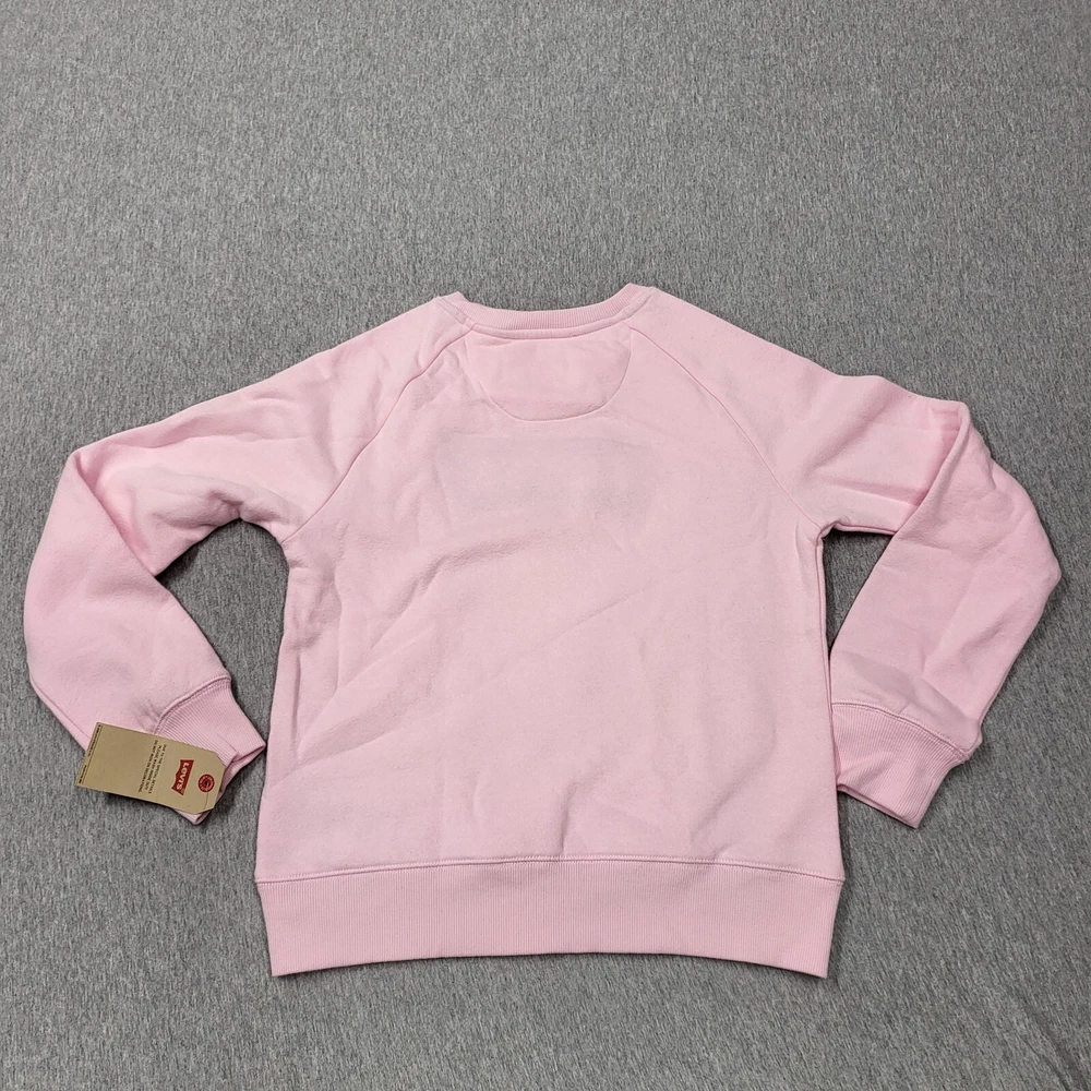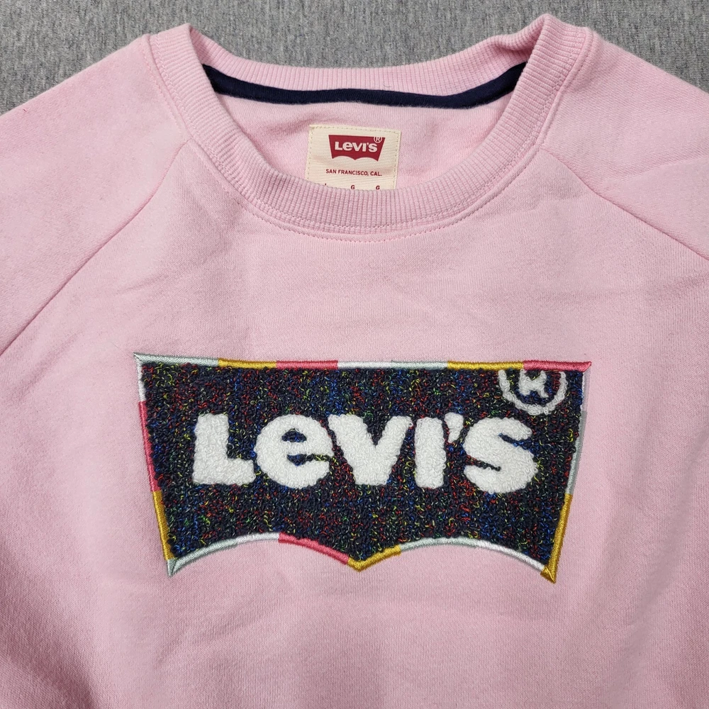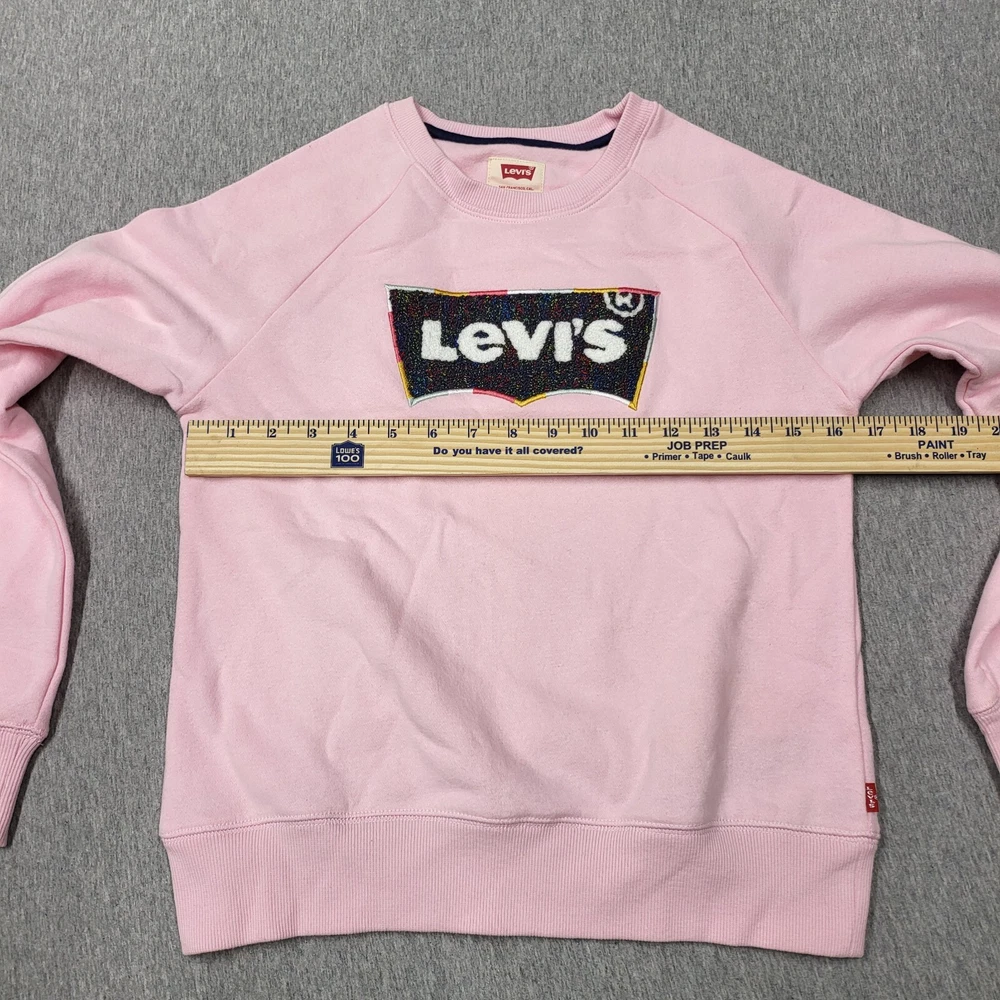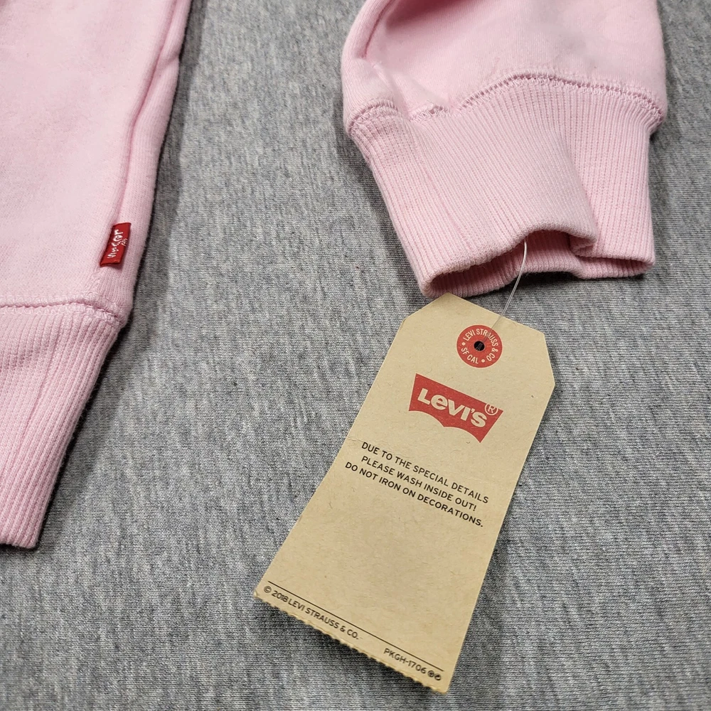 This is a brand new Levis kids' pullover sweater in pink with a big puff logo. This sweater is made of a comfortable and durable cotton blend material, perfect for any occasion. The long sleeve sweater has a crew neckline and is a size large, fitting 12-13 year olds. The sweater has a stylish and trendy Levi's theme, making it a great addition to any girl's wardrobe. It is perfect for casual outings or can be dressed up for more formal occasions. This sweater is a must-have for any fashion-savvy young girl. Get your hands on this new Levis kids' pullover sweater now!