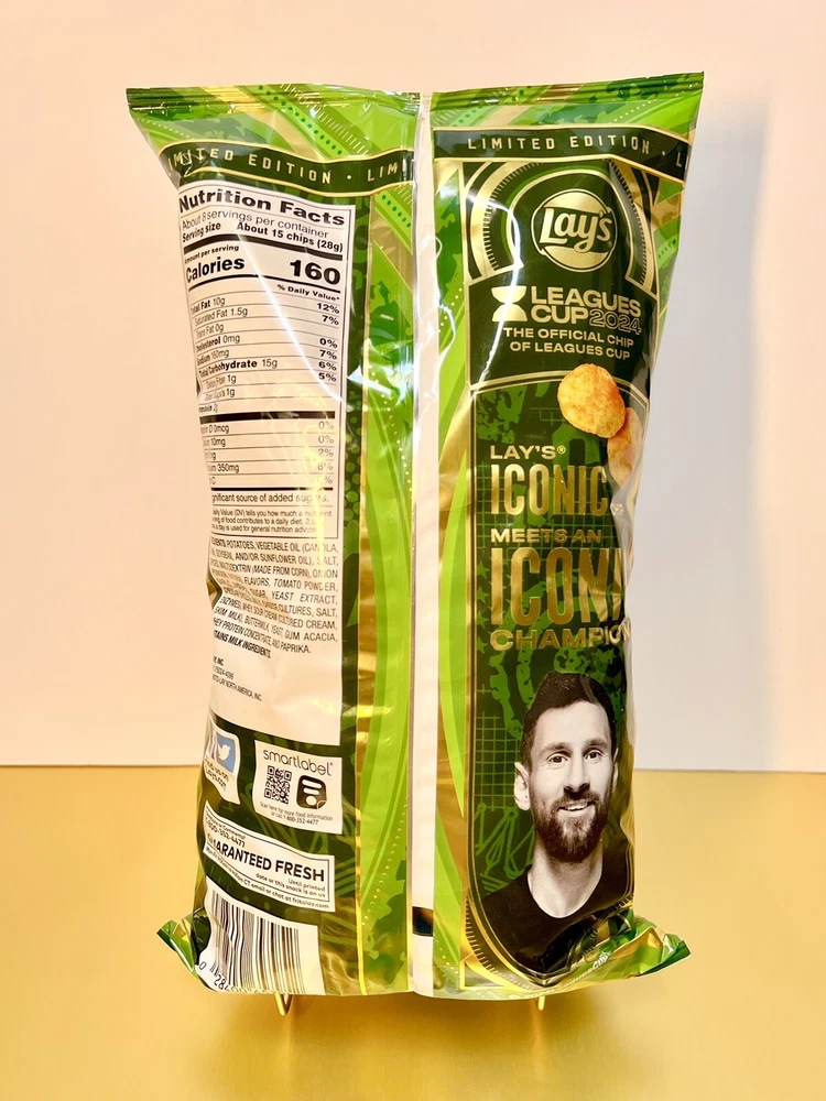 Indulge in the delicious flavor of Lay's CRISPY TACO Lionel Messi Inter Miami Potato Chips. These chips are perfect for snacking and appetizers, with a serving size of 15 chips and a total of 8 servings. The packaging is a single bag, and the product is made in the United States. The chips are flavored with a crispy and tangy taste, perfect for any American regional cuisine. The product is expired on 12-28-24, and it weighs 7.75 oz. Enjoy the snacking experience with Lay's CRISPY TACO Lionel Messi Inter Miami Potato Chips, a limited edition product perfect for any occasion.