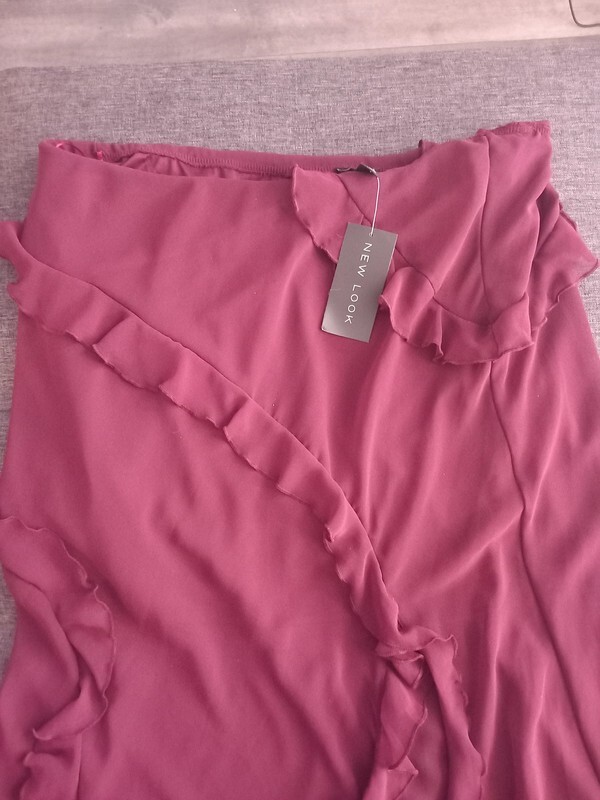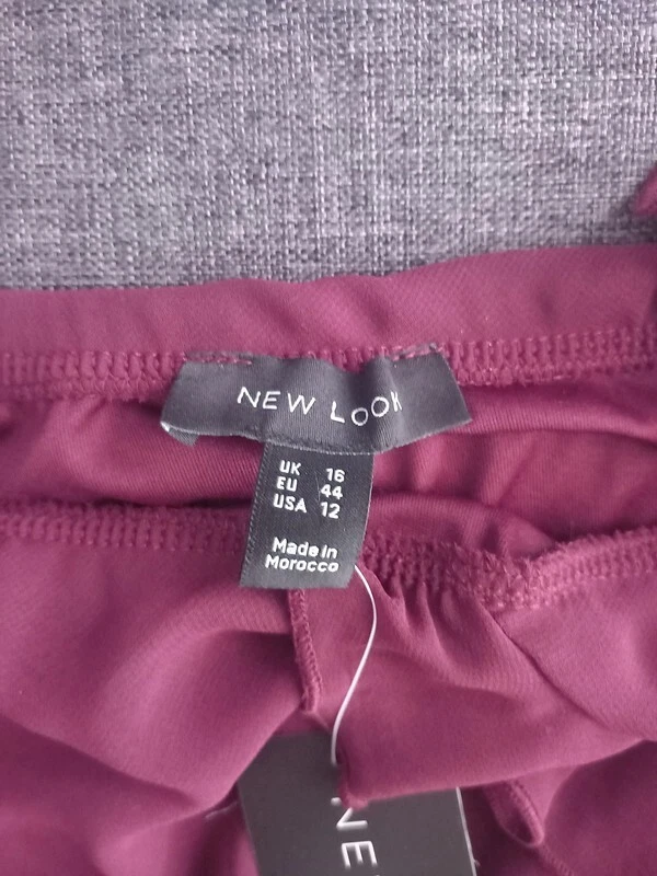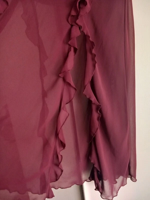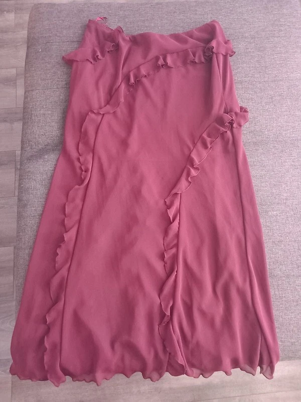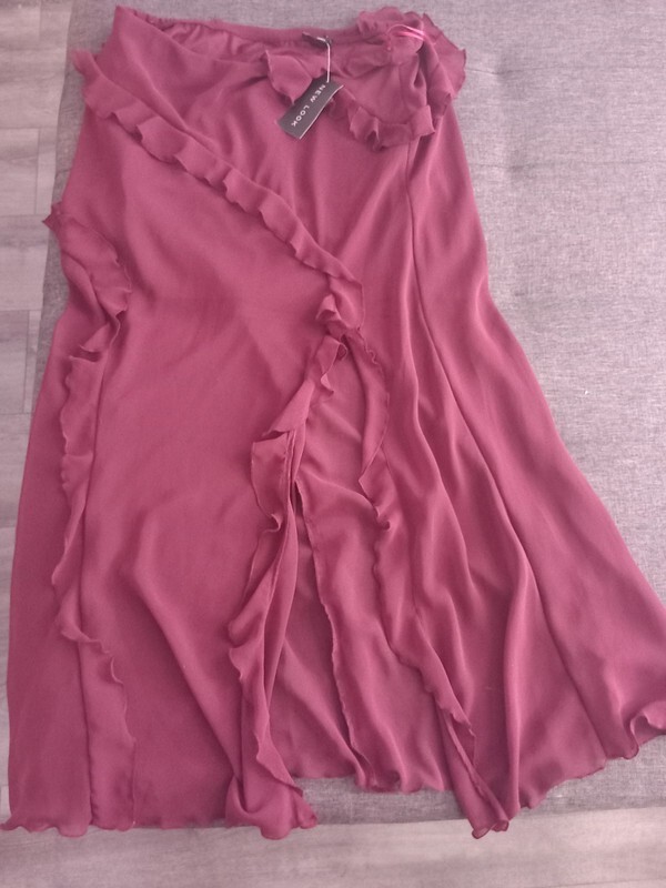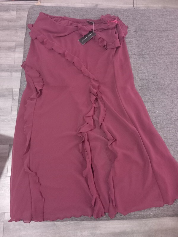 Step out in style with the New Look burgundy ruffle maxi skirt, a versatile piece that transcends occasions from casual gatherings to formal events. The skirt's elegant ruffle accents and flowing chiffon material offer a touch of sophistication to any ensemble. With its elasticated waist and side slit detail, this skirt promises both comfort and ease of movement. Crafted in a rich burgundy hue, this size 16 skirt caters to a regular fit and is machine washable for effortless upkeep. Suitable for all seasons, it's a timeless addition to your wardrobe, whether you're attending a wedding, enjoying an evening out, or simply adding a dash of class to your daytime look.