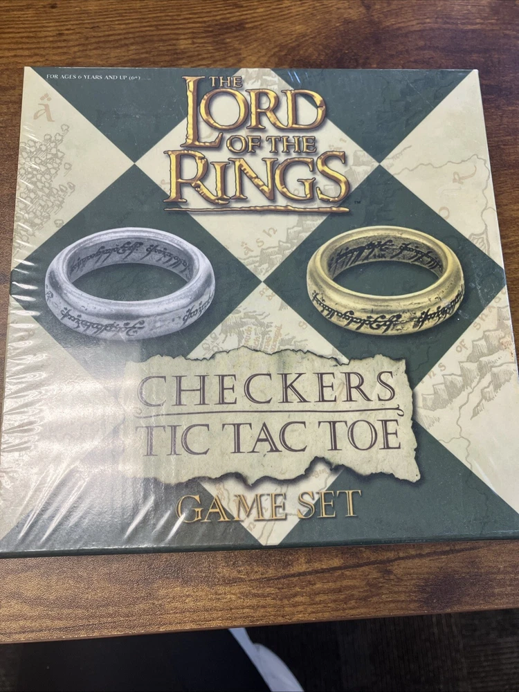 The product is a new Lord of the Rings Checkers/Tic Tac Toe board game set that is sealed in its original packaging. It is a game board featuring characters from the Lord of the Rings franchise, intended for players aged 6 years and up. The game can be played as traditional checkers or tic-tac-toe, providing entertainment for individuals in the age ranges of 12-16 years, 8-11 years, and 17 years & up who are fans of the Lord of the Rings series. Created by USAopoly, this board game offers a themed gameplay experience centered around the world of war in the Lord of the Rings universe.