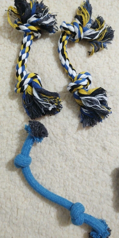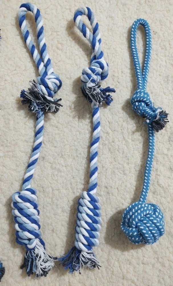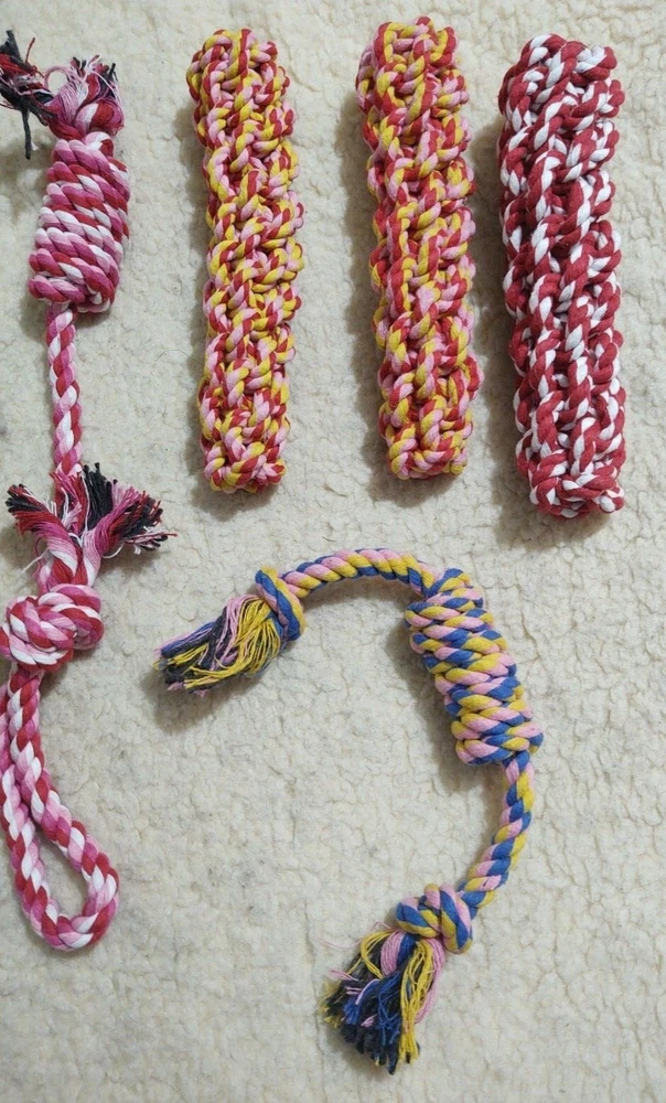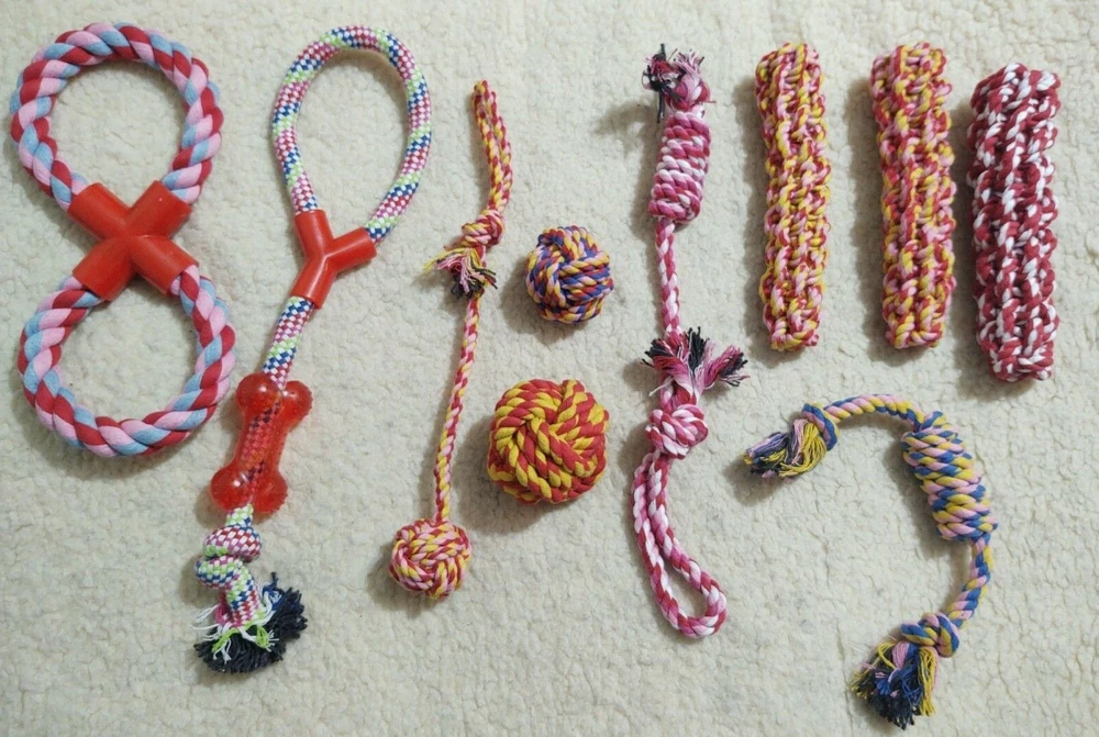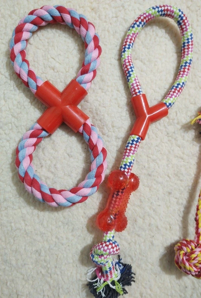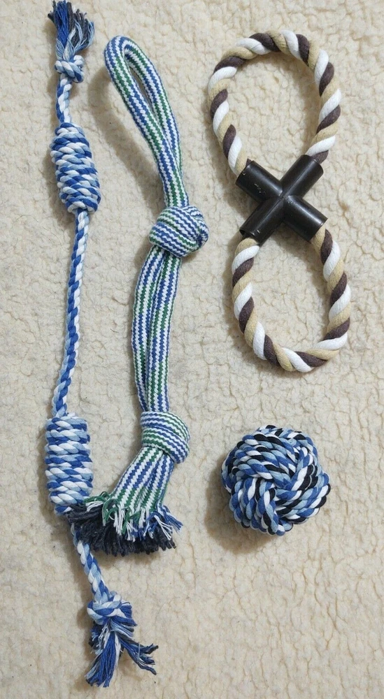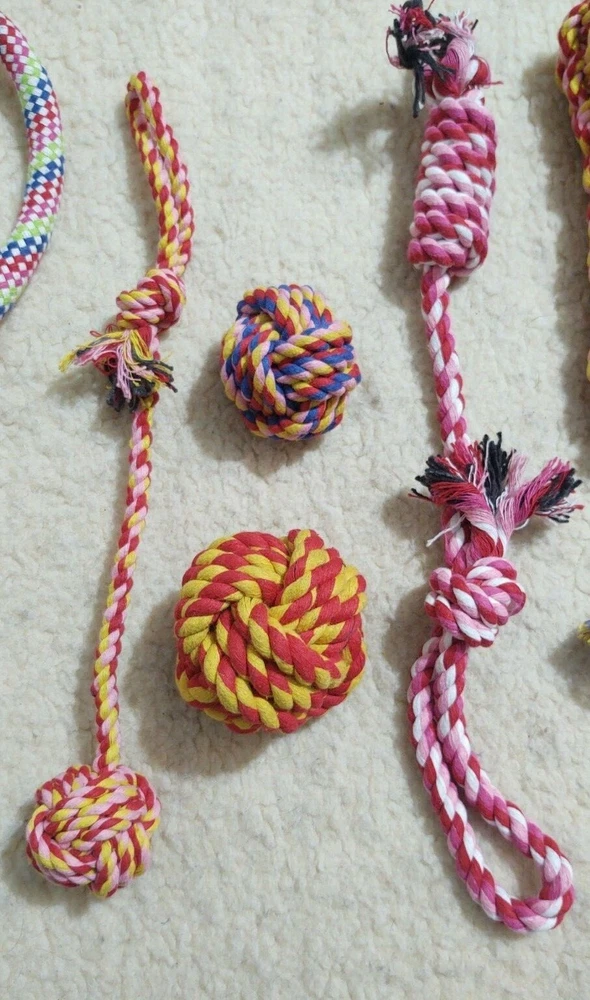 New Lot of 10 Dog Toys (inv21) Variety of Ropes, Balls, Tug See pictures for actual package 2 packages are available. You choose: Blue Lot or Pink/Red Lot Note you are only buying ONE lot of 10 toys. From a smoke free home. Please note Iowa buyers have sales tax.