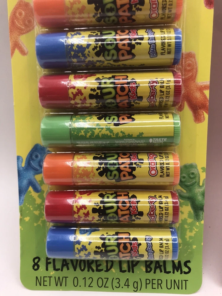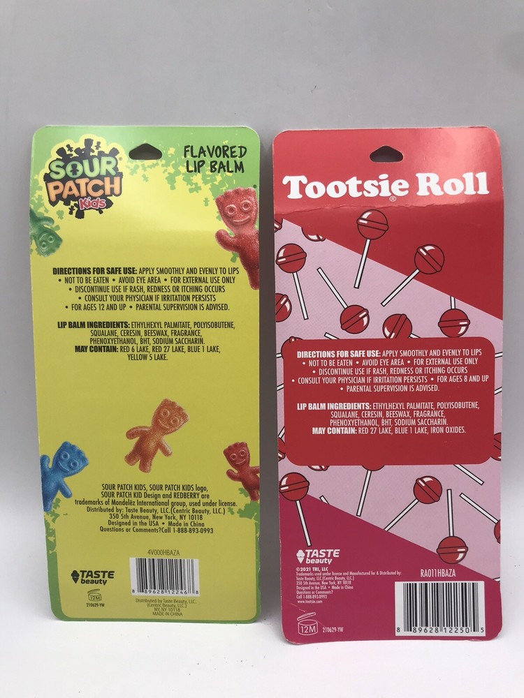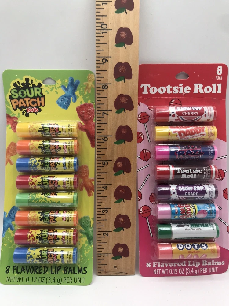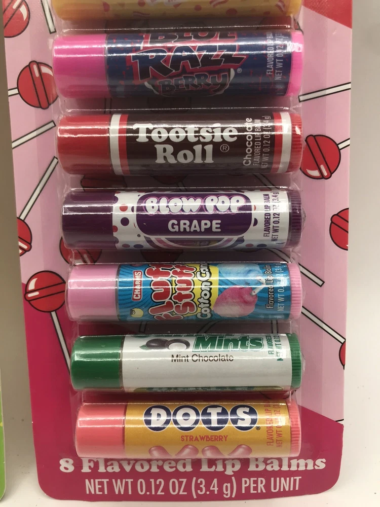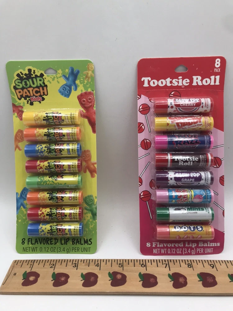 NEW Lot of 2 Flavored Lip Balm 8 Ct Sets ~ Tootsie Roll (+ Blow Pop Cherry and Grape, Dots, York Mints, Fluff Stuff Cotton Candy, Razz Berry and Sugar Daddy flavors) and Sour Patch Kids (Blue Raspberry, Redberry, Orange and Lime flavors). New in original package. No return on this item.