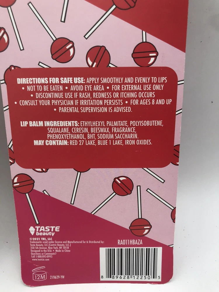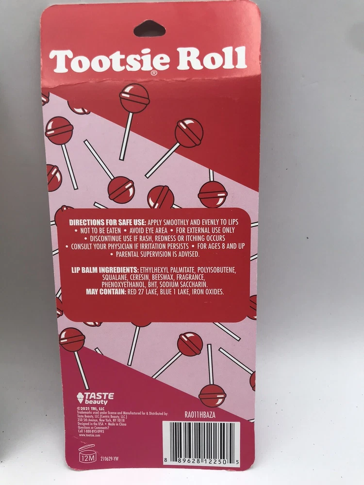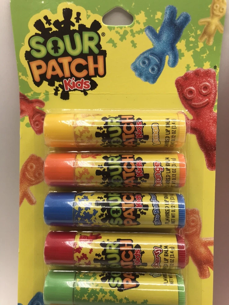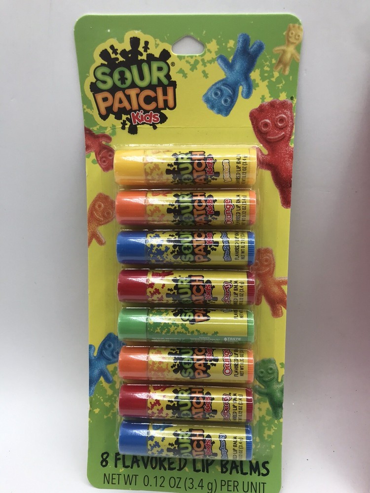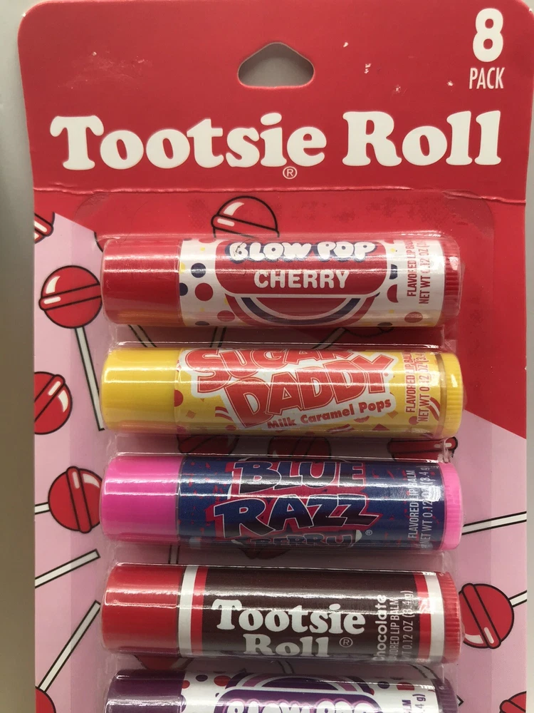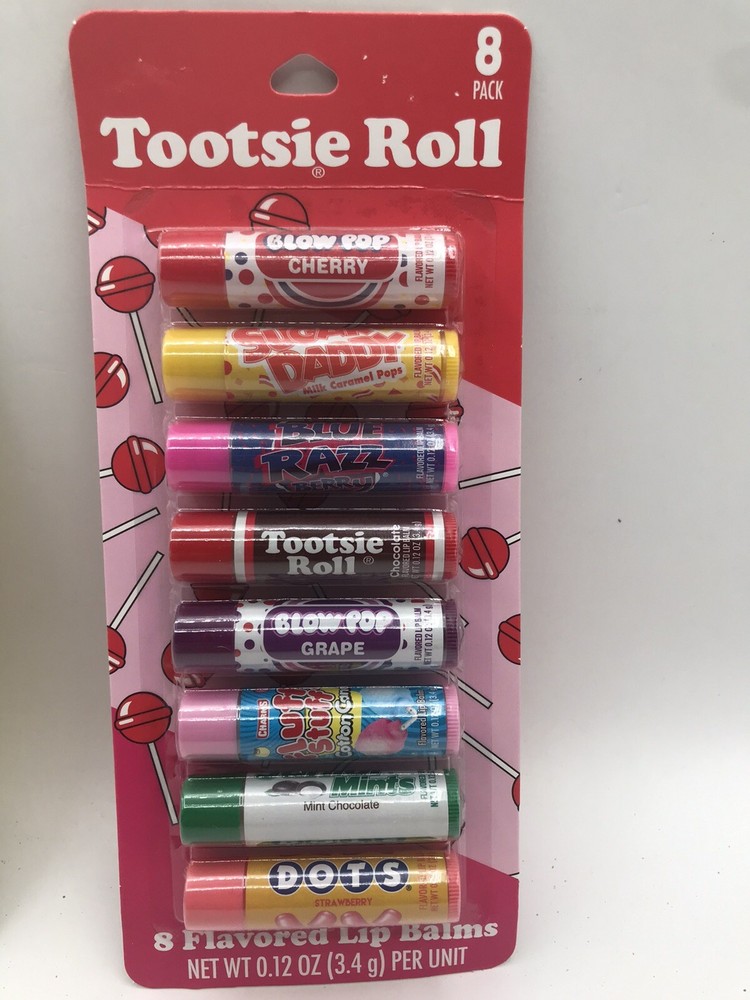 NEW Lot of 2 Flavored Lip Balm 8 Ct Sets ~ Tootsie Roll (+ Blow Pop Cherry and Grape, Dots, York Mints, Fluff Stuff Cotton Candy, Razz Berry and Sugar Daddy flavors) and Sour Patch Kids (Blue Raspberry, Redberry, Orange and Lime flavors). New in original package. No return on this item.