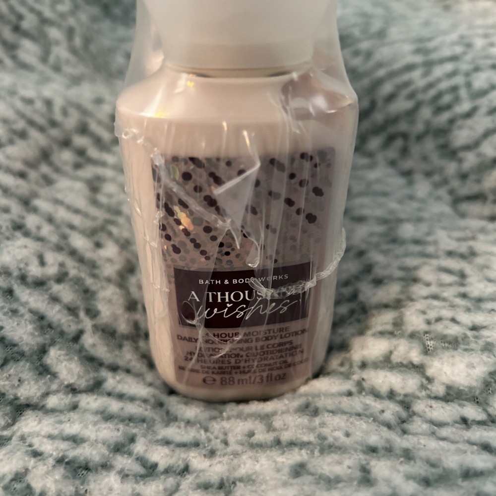 Ingredients:Shea Butter, Vitamin EMaterials sourced from:United StatesBody Area:BodyUPC:0667556804607Formulation:CreamSize:TravelColor:CreamScent:A Thousand WishesDepartment:Men, Teens, Unisex, WomenProduct Line:Bath And Body Works A Thousand WishesBrand:Bath & Body Worksgtin13:0667556804607Skin Type:AllFeatures:Animal Cruelty-Free, HydratingType:Body LotionVolume:3 fl oz