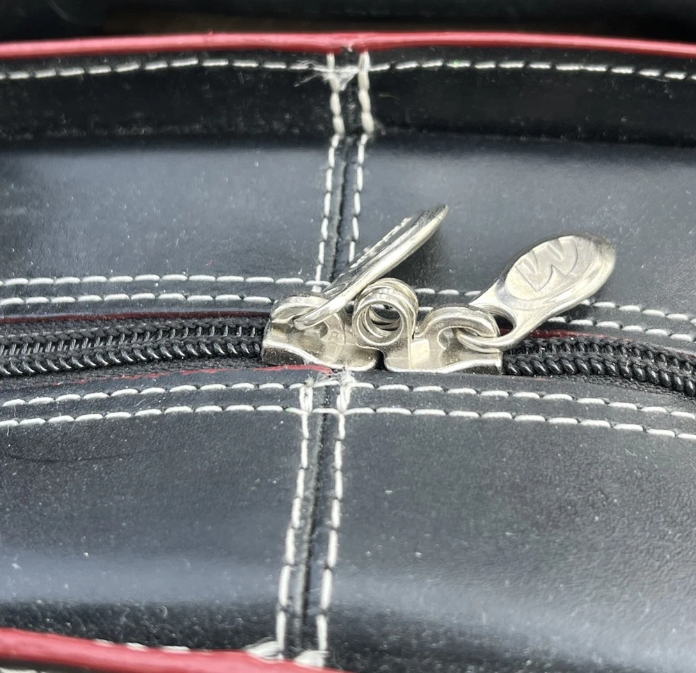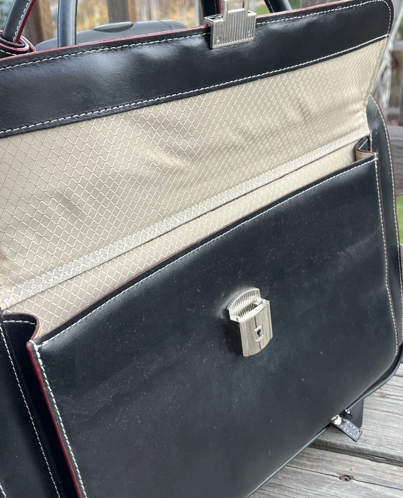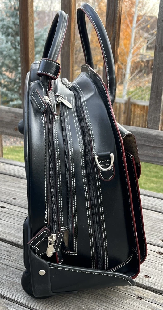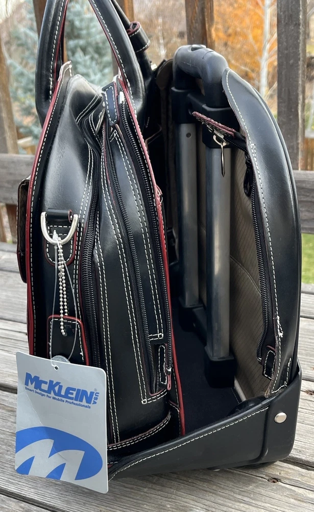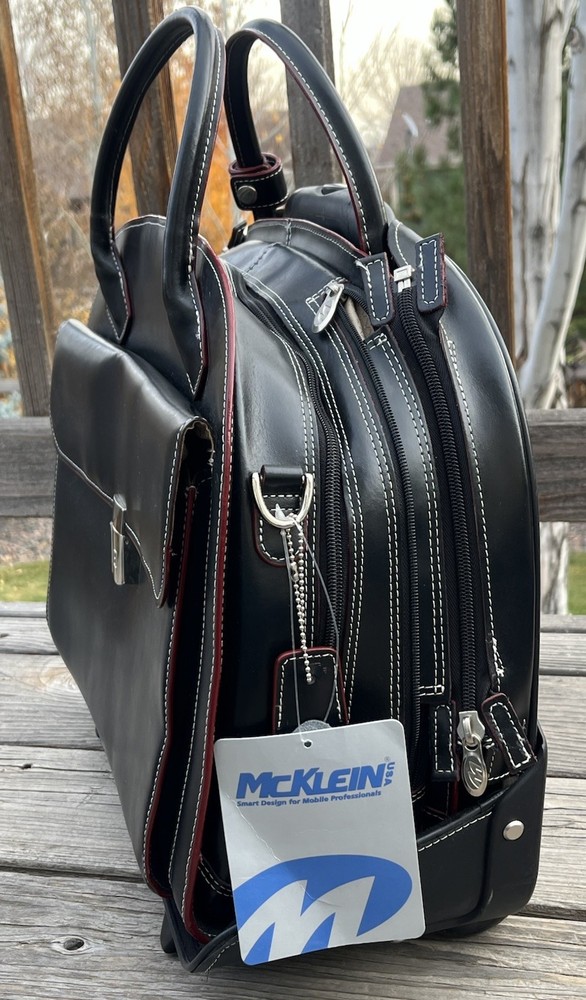 New! McKlein Glen Ellyn 94365 Black Leather Detachable Wheeled Women's Briefcase Case Bag Removable wheeled sleeve Top handles Telescopic handle Measures approx: 15"HX17"WX7"D New with tags - missing detachable shoulder strap