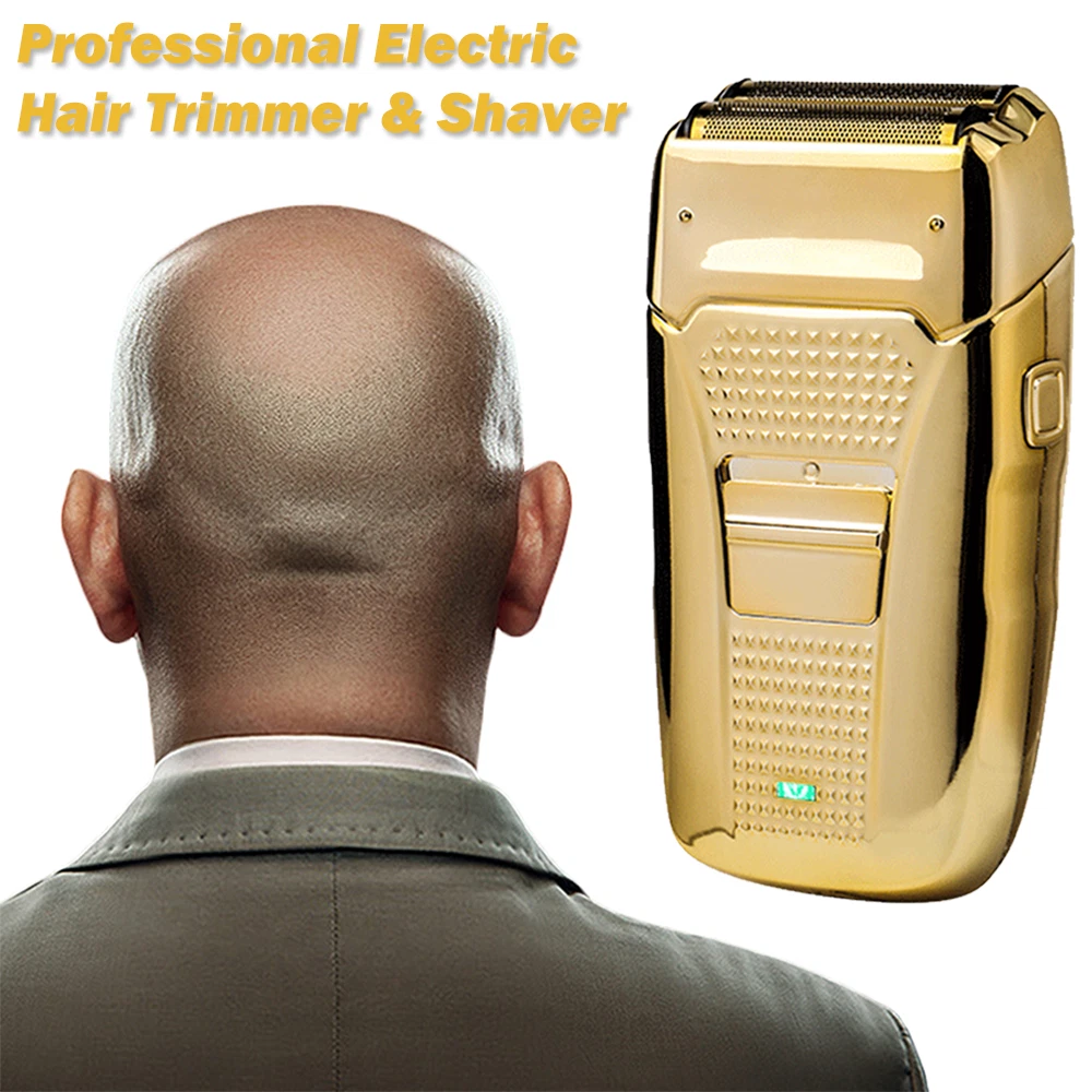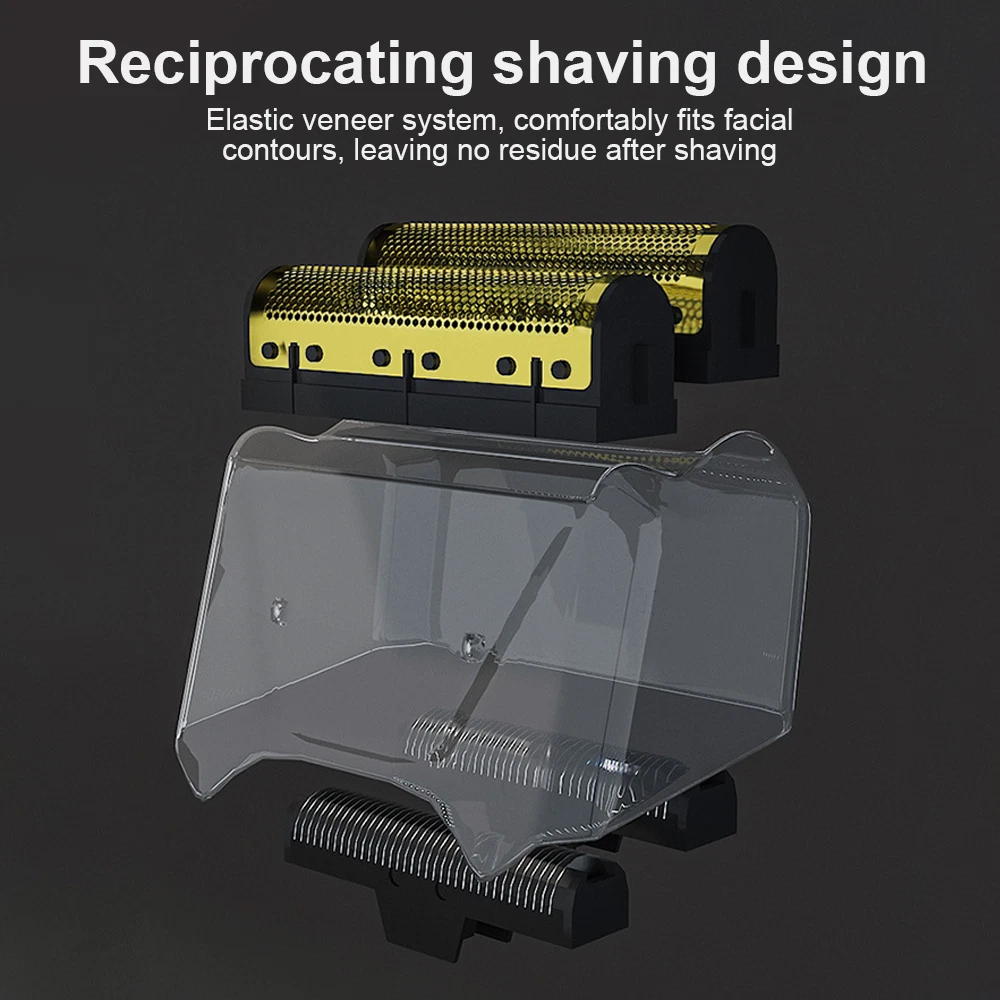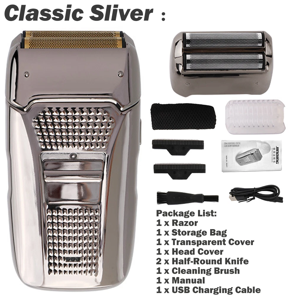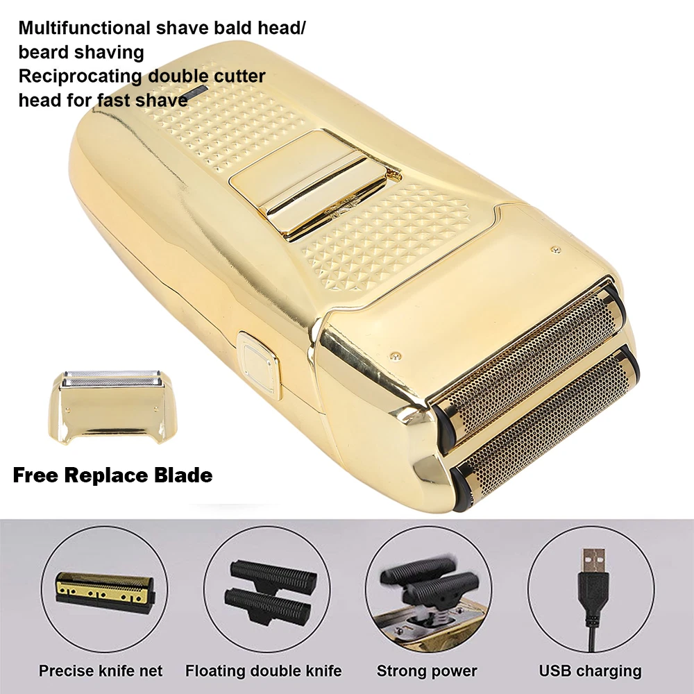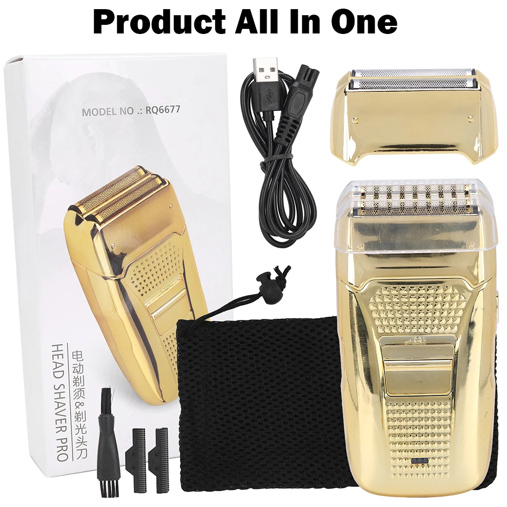 Des c ri p tion: Comfortably Fits Facial Contours: Alternate shaving design, elastic facial adjustment system, conforms comfortably to facial contours, no residue after shaving. Double Blade Design: Slim Screen Knife Net, Floating Face Adjustment to Quickly Capture Beard. Double blade design, fast cutting beards, incisive and not glued. Dual-purpose charging plug: Dual-use charging and plug, USB charging design, equipped with USB charging cable, can be connected to a variety of USB power ports, convenient charging. Multifunctional: Multifunctional, can be used to shave the bald head and shave the beard. Conforms to the ergonomic design, easy to grip and use. Easy to carry: Light and small in size, equipped with a storage bag, easy to carry when going out. Condition: 100% Brand New Item Type: Razor Material: ABS Color: Gold/Gray Power: 3w Charging Time: 5 Hours Use Time: 50 Minutes Battery: Lithium Battery 600mAh Battery Model: 14500 Razor Size: Approx. 12.5 x 6.5 x 3cm / 4.9 x 2.6 x 1.2in Weight : 270g(with box) Package List: 1 x Razor 1 x Storage Bag 1 x Transparent Cover 1 x Head Cover 2 x Half-Round Knife 1 x Cleaning Brush 1 x Manual 1 x USB Charging Cable