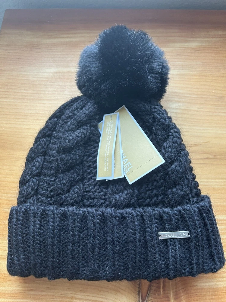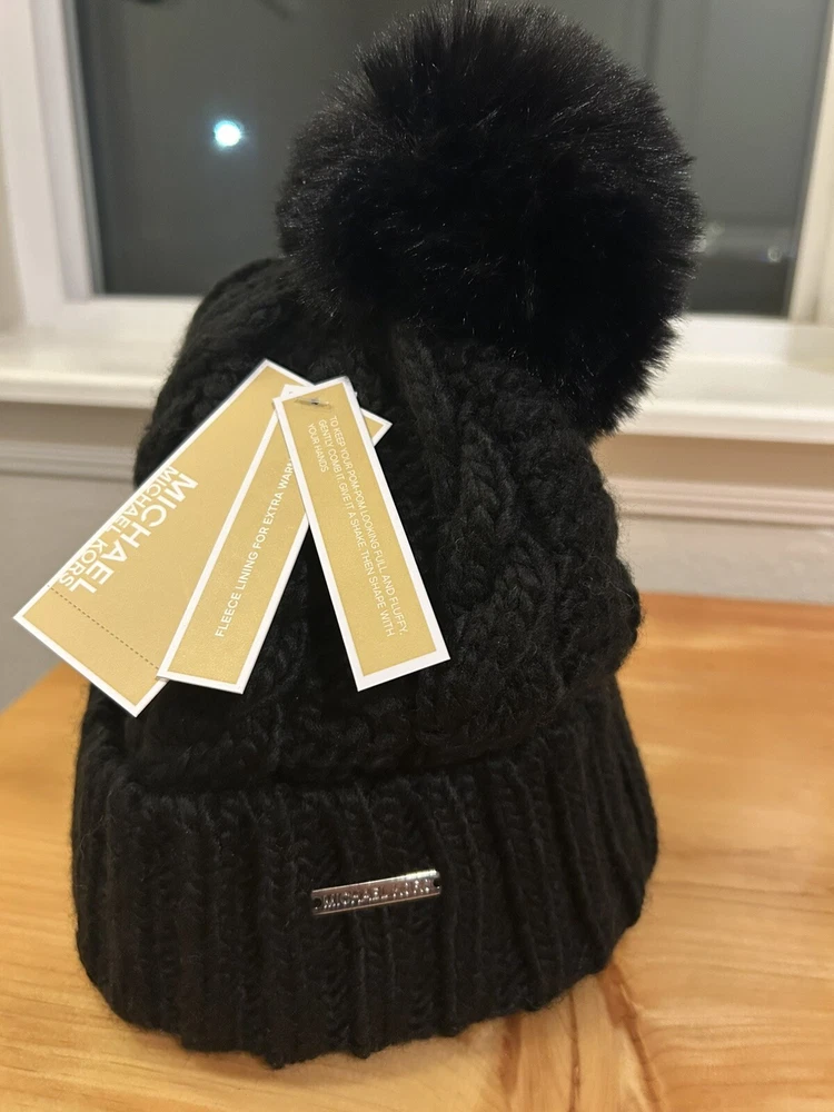 New! Michael Kors Cable Knit Pom Beanie Women’s Fleece LinedHat Black, MSRP $68
