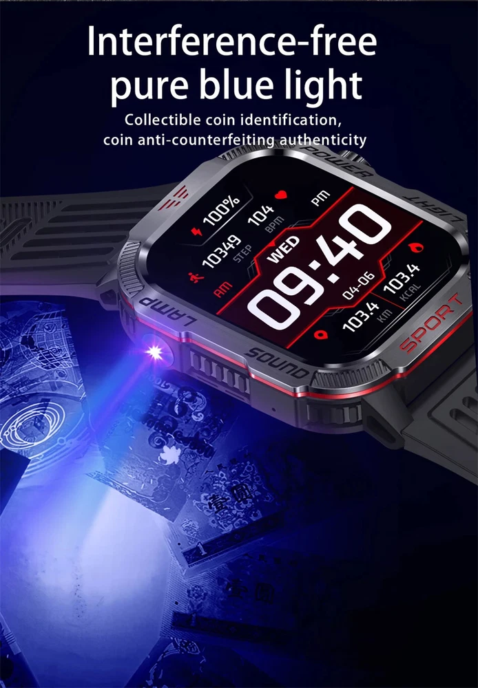 Features 1. High-Resolution Screen :The Smart Watch features a 2.01-inch high-resolution screen, providing a clear and vibrant display for all your notifications and fitness data. 2.Compass outdoor adventure magic weapon:Accurately measure and calibrate the current heading East E South S West W North N) degrees of the heading direction and the current time for outdoor adventures without getting lost. 3. Long-Lasting Battery :With a battery capacity of 600 mAh, this smart watch ensures long-lasting performance, allowing you to stay connected and track your fitness journey all day long. 4.Flashlight on wrist :Whether it is outdoor activities at night or night life lighting. Help you illuminate every corner. 5.Interference-free pure blue light:Unique blue light anti-counterfeiting function helps you to identify the coins in your collection and determine the authenticity of the coins 6. Waterproof Design :Designed for those who lead an active lifestyle, this smart watch is waterproof, making it suitable for various activities such as outdoor hand washing and workouts. 7. Health and Fitness Tracking :This smart watch not only tracks your calorie intake but also monitors your heart rate, making it a perfect companion for those who want to maintain their health and fitness. 8. Voice Assistant Functionality :Equipped with voice assistant functionality, this smart watch allows you to make Bluetooth calls and access voice services, offering convenience and ease of use. Basic function:Data, sports, sports records, weather, information, women, music,sidebar, stopwatch, timer, alarm clock, collection code, business card, calendar, calculator, search phone, camera,Health management(Exercise monitoring, sleep monitoring, heart rate monitoring, respiratory exercise),Sport mode,Conversation,WeChat campaign,Message and call reminder(Telephone, SMS, WeChat、QQ、WhatsApp、Line、Facebook、Facebook messenger、Kaokao、Twitter、Skype) Product Parameters: Screen:2.01 Inch screen Resolution:240*296 Touch Panel:Full screen touch Battery:600 mAhpolymer battery Charging mode:USB magnetic charging Waterproof:IP68 Bluetooth version: BLE 5.0 Charging time:Android 5.1 or IOS 8.2 or above supports Bluetooth 5.0 BLE system Languages:23 languages (Simplified Chinese, English, German, Russian, Spanish, Portuguese, French, Japanese,Arabic, Dutch, Italian, Czech, Greek, Hebrew, Indonesian, Malay, Polish, Thai Vietnamese, Finnish, Romanian, Turkish, Croatian) 1. After receiving the watch, please use the charging adapter to charge the watch for more than 2 hours. 2. Please scan the QR code in the manual to download the APP before use.Packing List Smartwatch*1 Charging cable*1 Manual*1