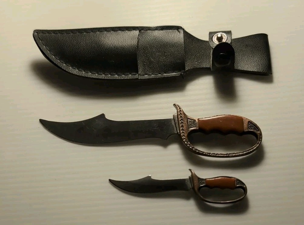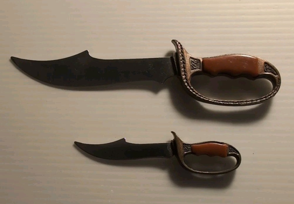 This Mini Double Knife Set features fixed blades made of stainless steel with a full tang and silver color. The set includes two mini pirate swords with blade lengths between 2-3 inches, featuring a plain edge and a plastic handle. Ideal for everyday carry, throwing, boot, or survival use, these knives come with a leather sheath for convenient storage and transport. Perfect for collectors or enthusiasts looking for unique and versatile blade options. See scans to help see the condition.