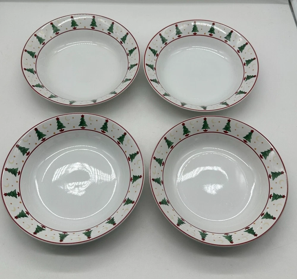 This is a set of four vintage Debbie Mumm cereal soup bowls from the "Magic Of Santa" collection by Sakura. The bowls feature a Christmas tree pattern in red and green colors on a round stoneware material. The design is original and printed on with a glossy finish, making them perfect for the Christmas occasion. Each bowl measures 7 5/8 inches in diameter.