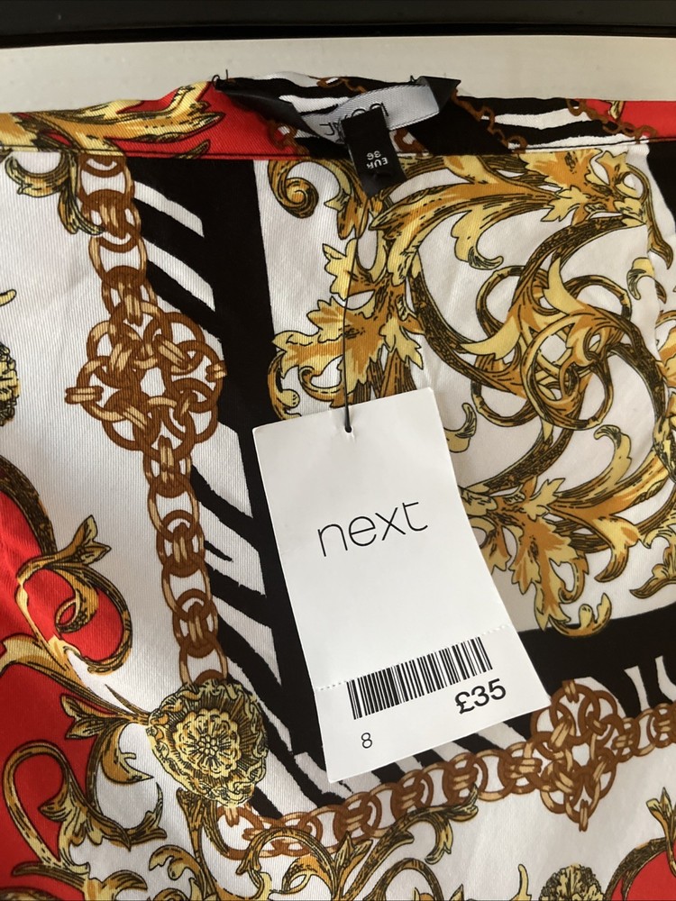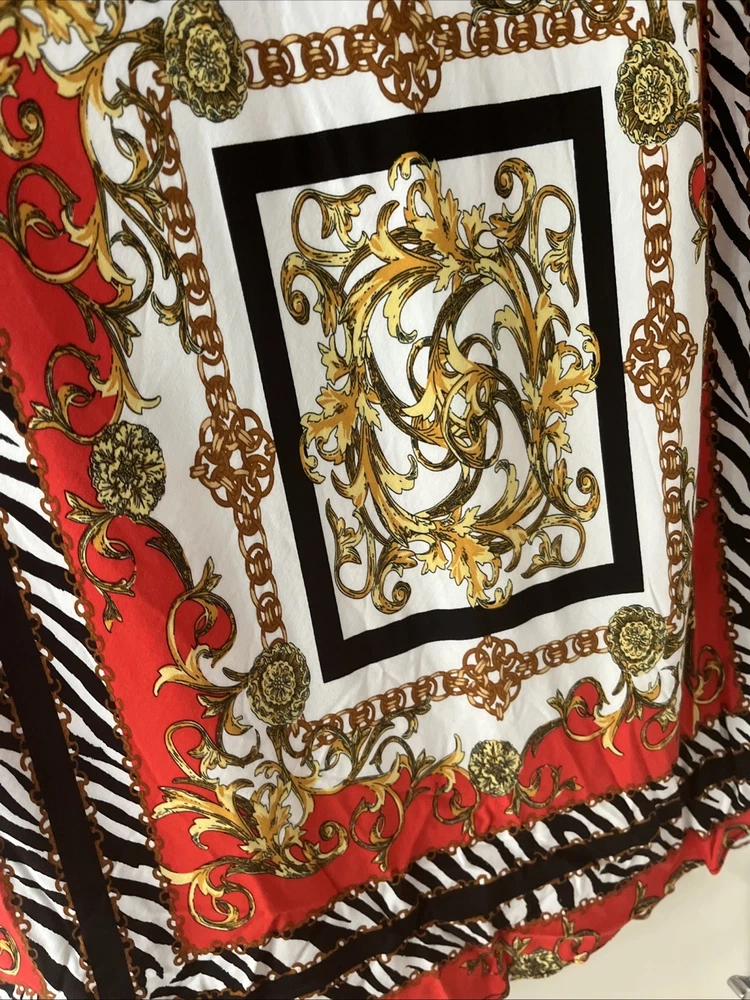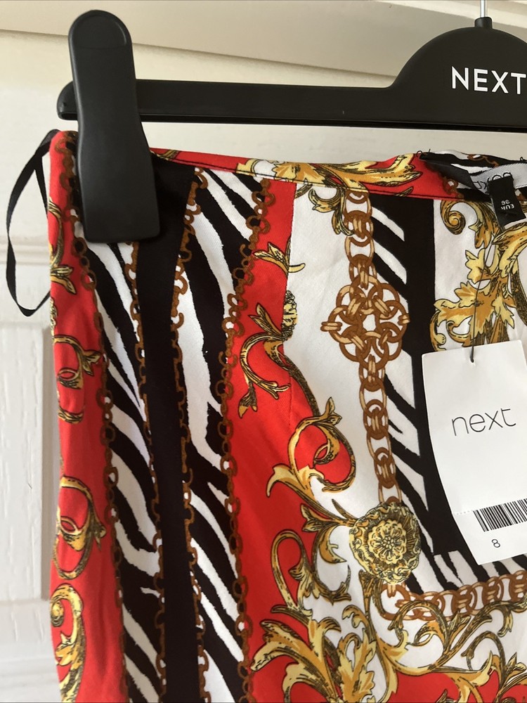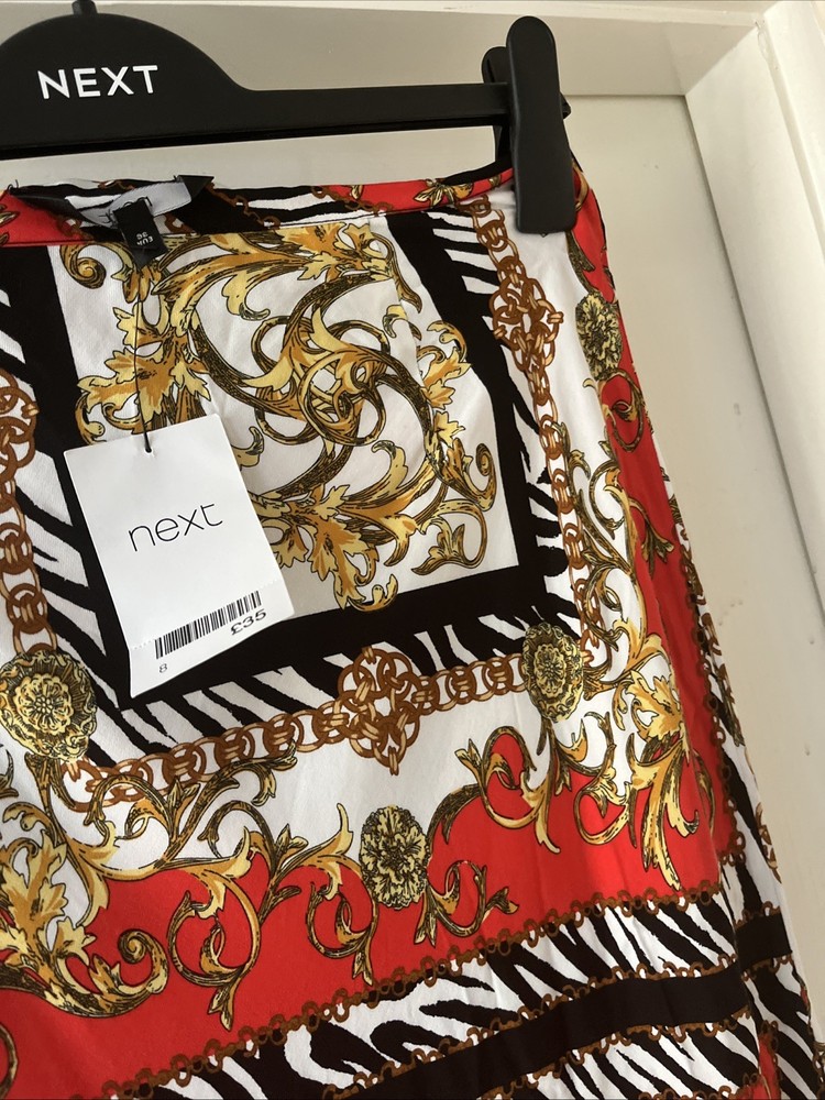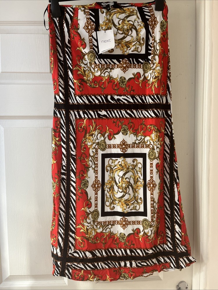 new next summer style long maxi skirt red black white gold pattern detail size zip fastening size 8 on label waist 28 inches total length 18 inches length in total 34 inches 100 % viscose new with label £35