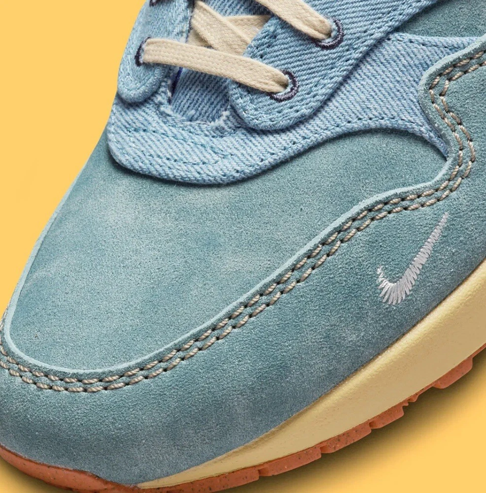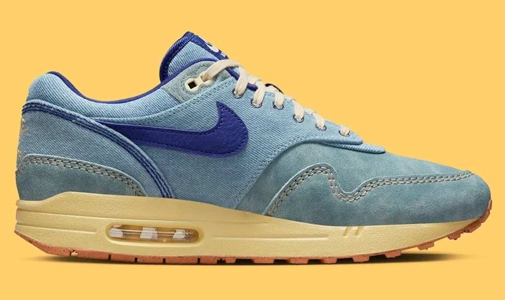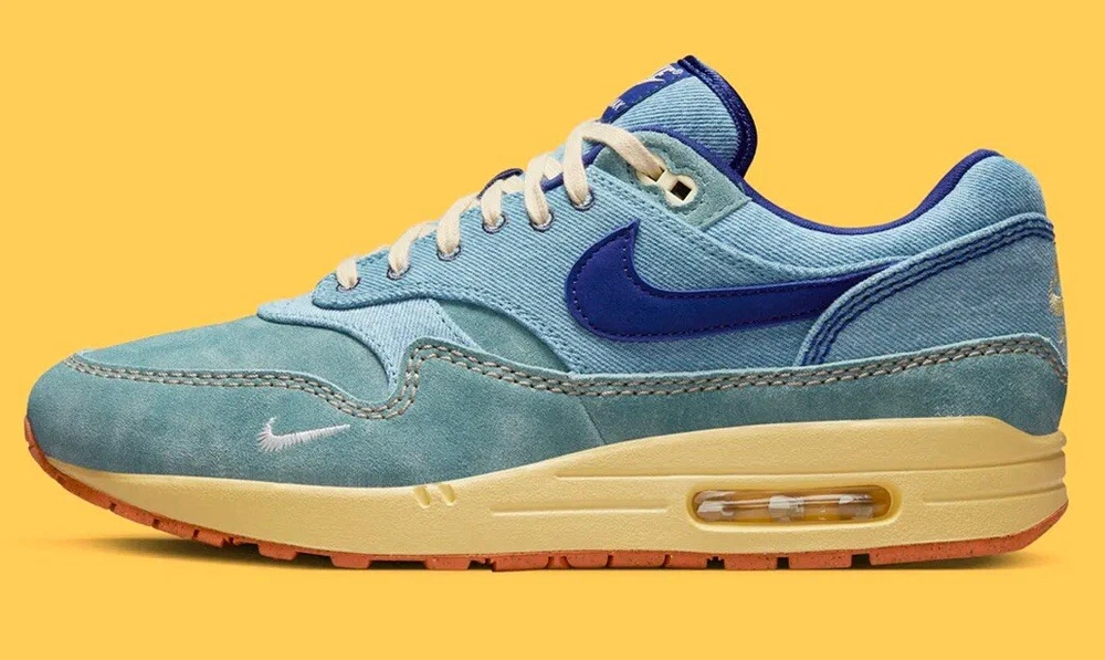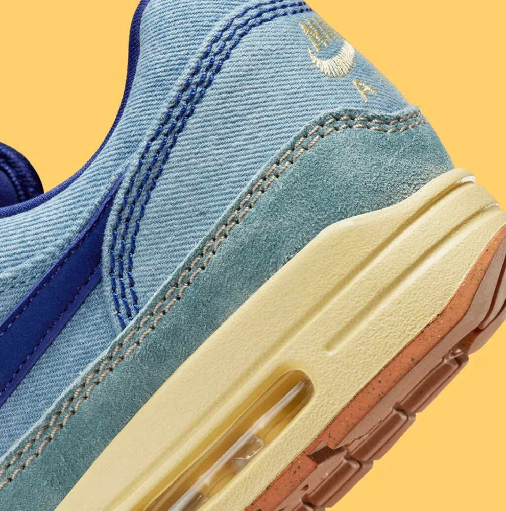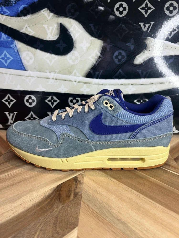 This is a pair of Nike Air Max 1 Premium Denim sneakers in size 11.5 for men. The shoes feature a low top shoe shaft style, blue denim upper material, and a retro design. They are part of the Nike Air Max product line and are a limited edition release from 2022. The sneakers are branded with Kith, Supreme, Cpfm, Travis, Exclusive, and Scott, and are nicknamed "Dirty Denim."