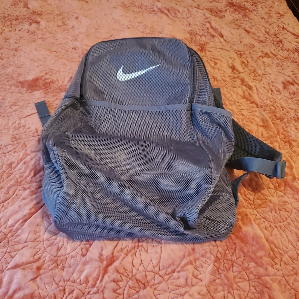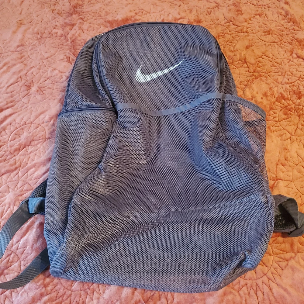 This is a large Nike Brasilia Mesh Training Backpack in gray, designed for unisex kids. It features a solid pattern with a see-through mesh fabric type, a zip closure, and a school theme. The backpack is 12 inches wide and 16 inches high, made of polyester material. It is suitable for back-to-school use and is brand new without tags. if you have any question feel free to message me