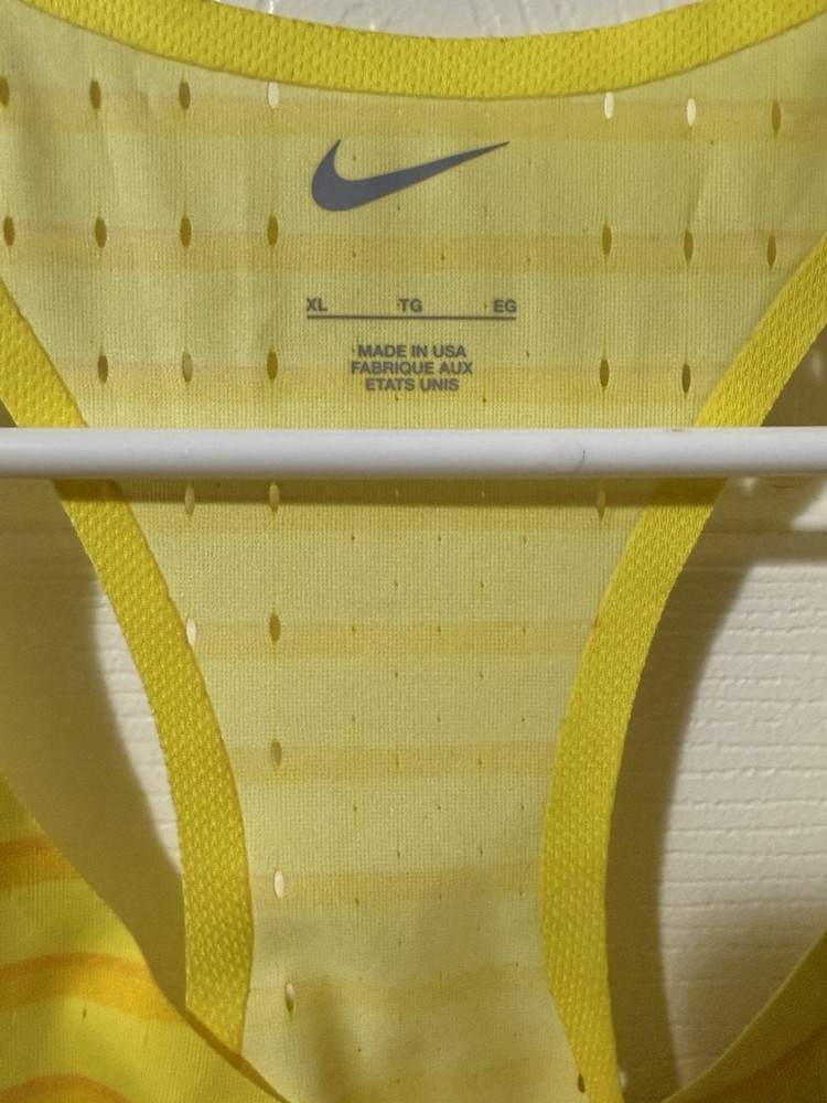 Model: Nike Dri-Fit MPN: Cu9996-704 Department: Women Closure: Pullover Performance/Activity: Running & Jogging Occasion: Activewear Size: XL Brand: Nike Color: Yellow Fit: Slim Size Type: Regular Type: Tank Neckline: Round Neck Strap Type: Racerback Fabric Wash: Medium Product Line: Nike Pro Elite Exterior Color: Multicolor Features: Breathable, Lightweight, Moisture Wicking Style: Pullover Sleeve Length: Sleeveless Pattern: Striped