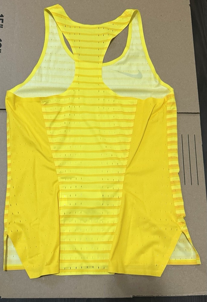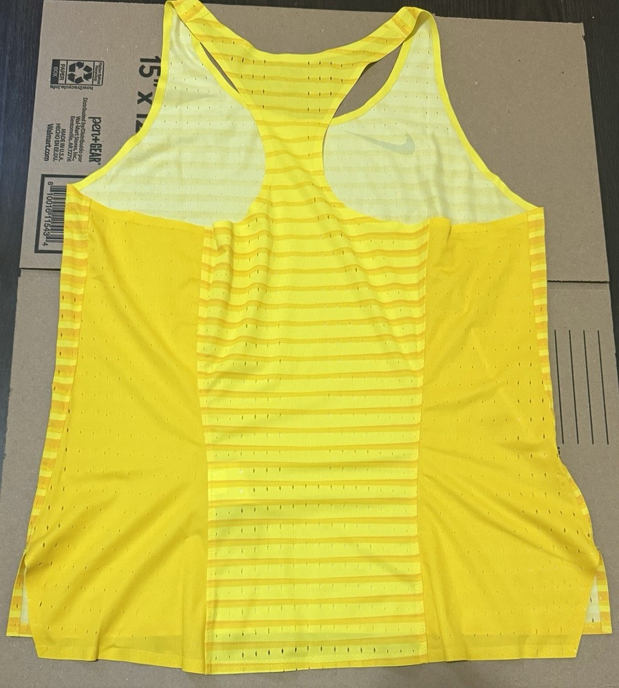The product is a Nike Pro Elite women's size XL track and field running singlet tank in a vibrant yellow color with a striped pattern. This sleeveless tank features a round neck and a pullover closure, perfect for running and jogging. Made with lightweight and breathable fabric, it is designed for moisture-wicking performance, making it a stylish and functional choice for active women. The Nike Dri-Fit technology ensures a comfortable and slim fit, ideal for those who prioritize both style and functionality in their activewear.