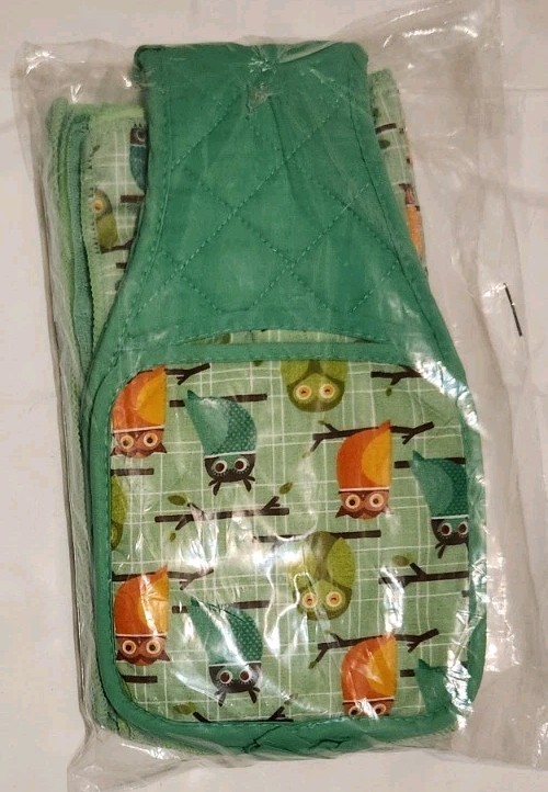 The New Owl 7 Piece Gift Set Pot Holders Towels features a charming owl pattern in a green color, perfect for adding a fun touch to your kitchen decor. Made from soft cotton material, these potholders are practical and stylish, featuring a cute owl design that will delight any owl lover. This set includes 7 pieces, providing you with plenty of potholders to use in your kitchen while adding a touch of whimsy to your cooking experience. Ideal for any food or kitchen-themed home, this gift set is sure to be a hit with anyone who appreciates adorable and functional kitchen accessories.