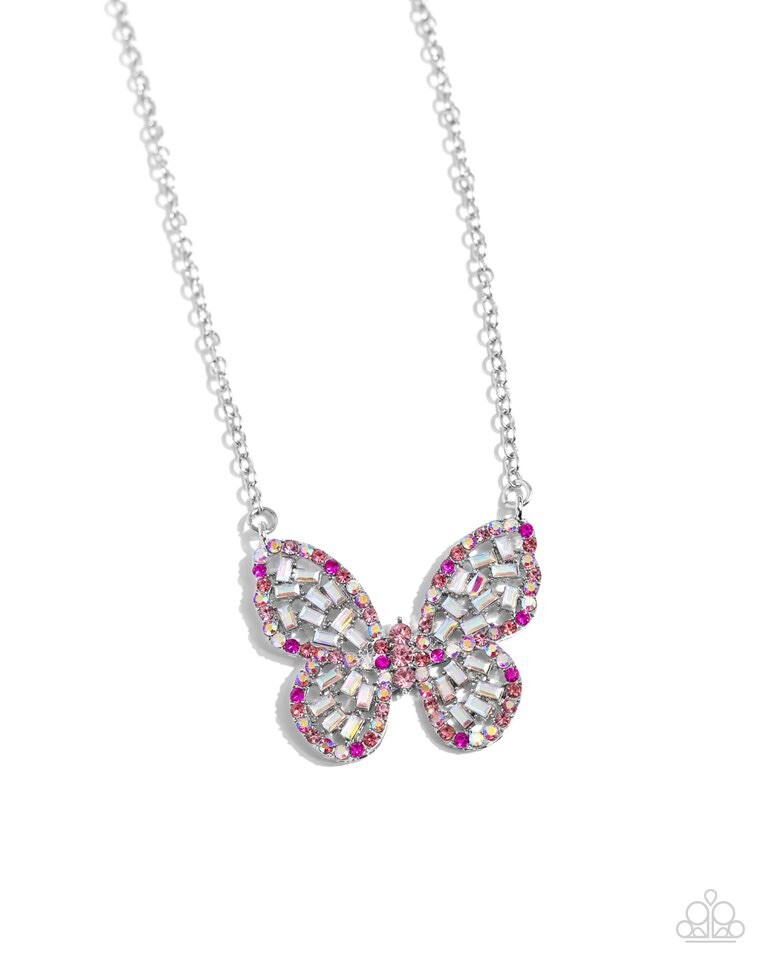 Adorned with a delicate array of pink and iridescent rhinestones, this enchanting silver butterfly glimmers with a collection of dainty white emerald-cut gems. Accented by soft rose rhinestones, the butterfly's body adds a playful burst of color. The piece features an adjustable clasp for a perfect fit, with its shimmering hues offering delightful variations in every piece.