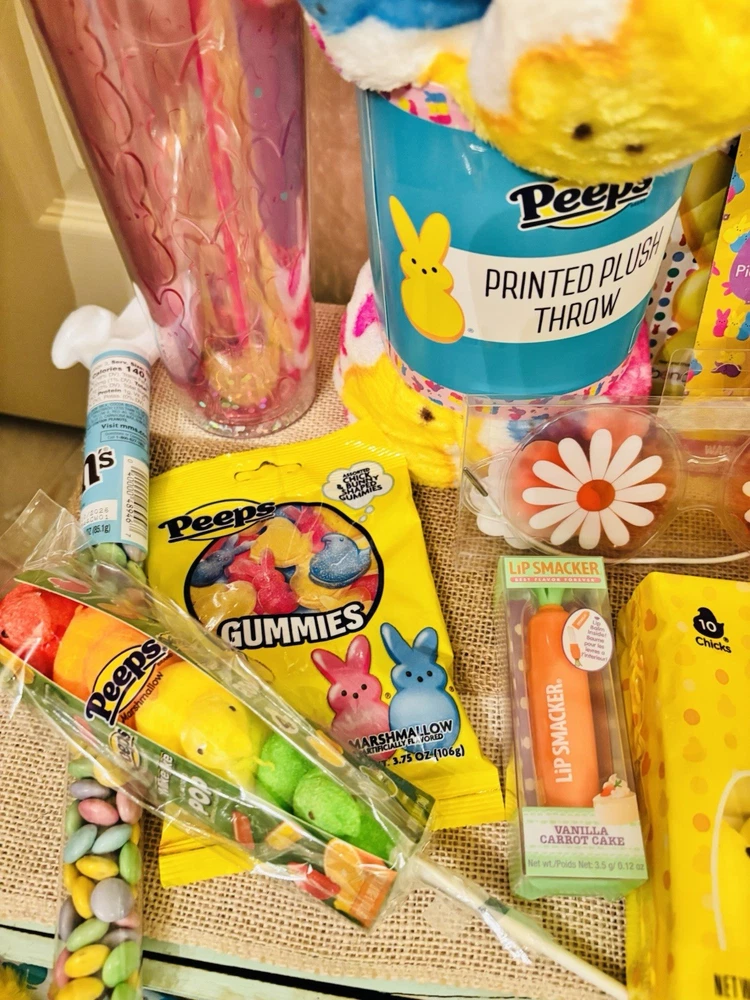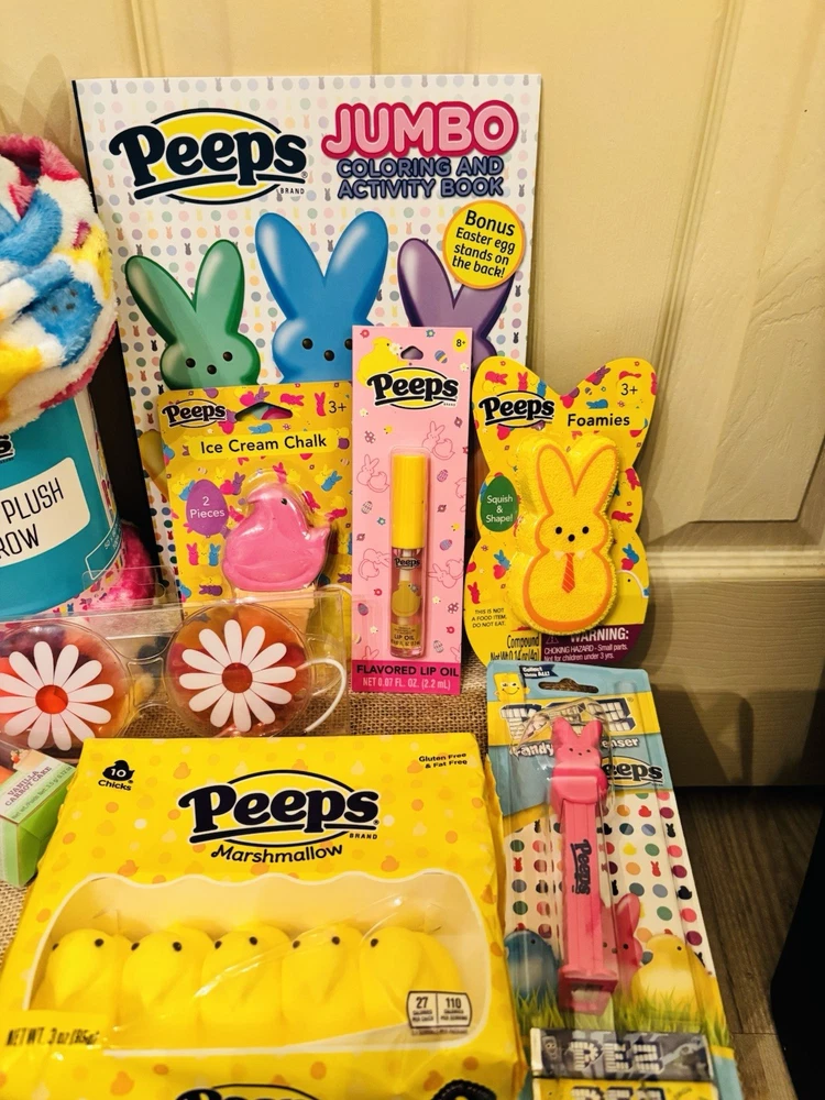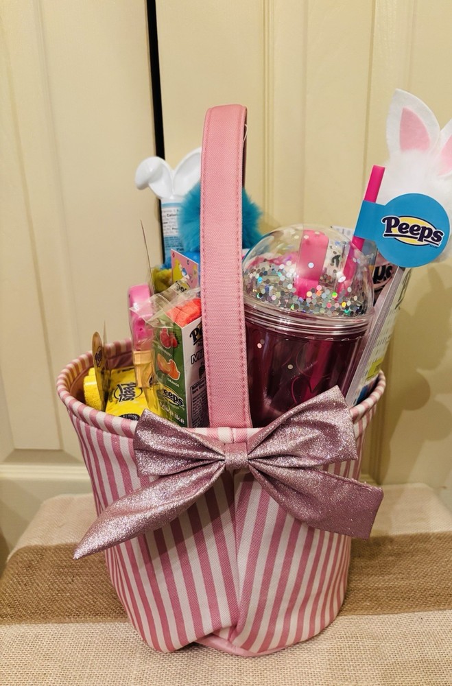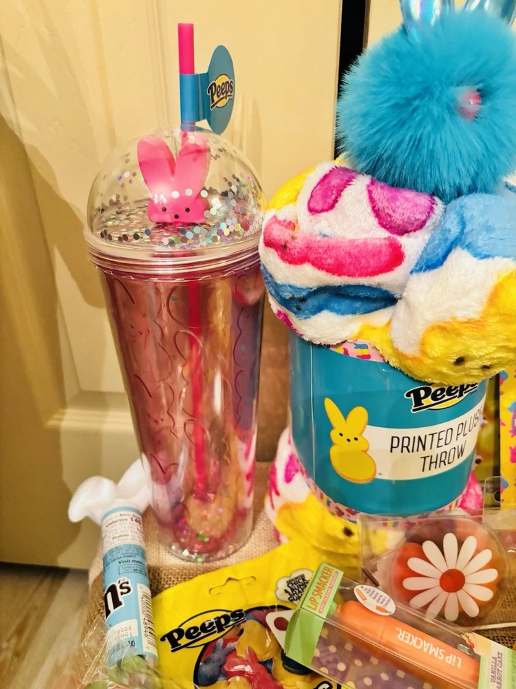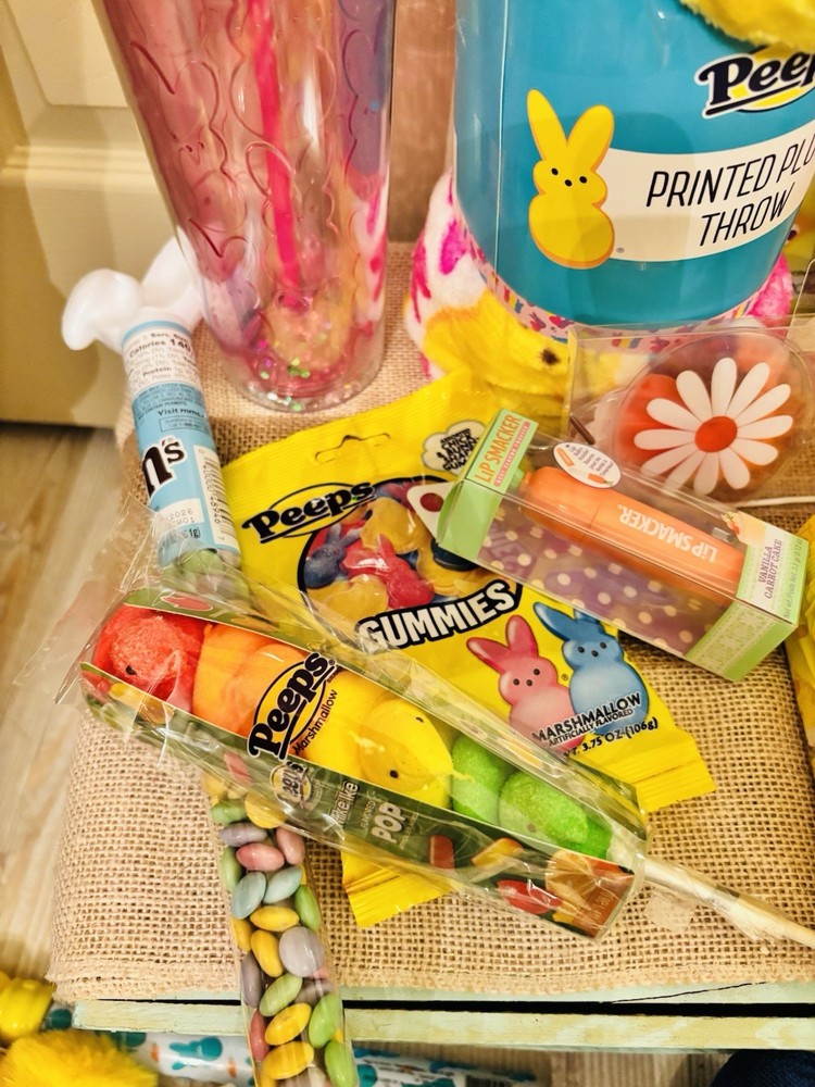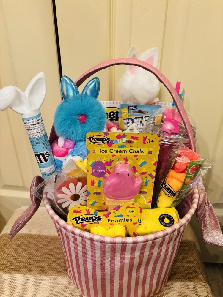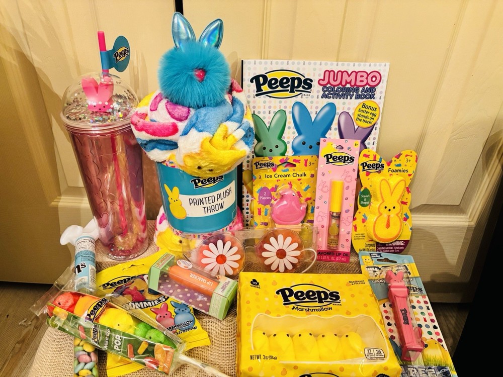 🩷Brand new , perfect Easter basket for that peeps lover! Your basket will include: Peeps coloring book Peeps throw blanket Pink peeps bunny tumbler Pom Pom bunny pen Peeps foamies Peeps ice cream chalk Peeps lip gloss Lip smackers lip balm 1 pack of yellow marshmallows chick’s 1 peeps pez dispenser Peeps gummies M&M’s Peeps chick mike & Ike’s Flower gel eye mask Large peeps bunny stuffy 💚All items are brand new and have never been used or opened. 💜Pink striped bow basket included 💚Extra surprise goodies will be included 😊 🩷Free Shipping!!