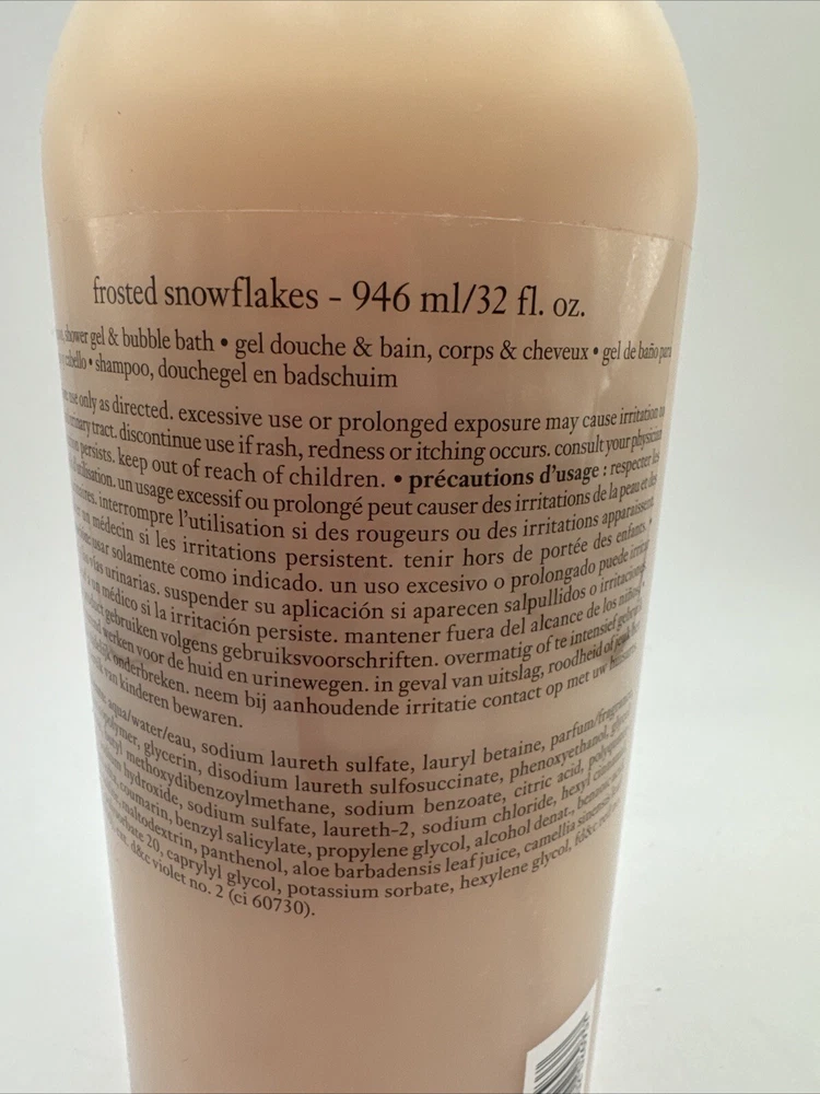 Size:JumboScent:Frosted SnowflakesVolume:32 fl ozCountry/Region of Manufacture:United StatesFormulation:LiquidBody Area:BodyCustom Bundle:NoColor:PinkBrand:PhilosophyUPC:3616302026937gtin13:3616302026937Department:UnisexType:Shower Gel