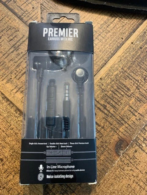 Premier Earbuds with Mic, New in Box. In-Line Microphone, Noise Isolation, Single click Answer/End, Double Click Next Track, 3-Click Previous Track, Up/Down Volume.